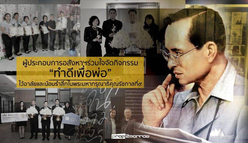 เดือนตุลาคม 2560 เป็นช่วงที่คนไทยทั้งประเทศต่างอยู่ในภาวะโศกเศร้า ทุกภาคธุรกิจต่างพร้อมใจกันในการร่วมไว้อาลัยและน้อมรำลึกในพระมหากรุณาธิคุณพระบาทสมเด็จพระปรมินทรมหาภูมิพลอดุลยเดช ด้วยการทำกิจกรรม “ทำดีเพื่อพ่อ”ที่หลากหลาย ซึ่งในส่วนของผู้ประกอบการอสังหาฯก็เช่นกัน ต่างหยุดทำกิจกรรมทางการตลาดตลอดทั้งเดือนตุลาคมนี้ และจัดกิจกรรมทั้งในเรื่องของการร่วมประดิษฐ์ดอกไม้จันทน์ การทำความสะอาดสถานที่สาธารณะ เป็นต้น