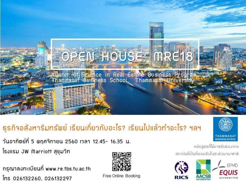 ผศ.ดร.นิติ รัตนปรีชาเวช ผู้อำนวยการโครงการปริญญาโทธุรกิจอสังหาริมทรัพย์ คณะพาณิชย์ฯ ธรรมศาสตร์ เปิดเผยว่า ทางคณะพาณิชย์ฯ ได้จัดหลักสูตรปริญญาโทธุรกิจอสังหาริมทรัพย์อีกครั่ง หลักสูตรจะให้ความรู้ครอบคลุมในทุกมิติของธุรกิจอสังหาริมทรัพย์ โดดเด่นด้านความร่วมมือและแลกเปลี่ยน Know How ทั้งภาคเอกชนและมหาวิทยาลัยในต่างประเทศจำนวนมาก ซึ่งผู้ที่สนใจจะได้รับความรู้เพื่อใช้ในการบริหารงานที่เกี่ยวกับอสังหาริมทรัพย์ และช่วยให้สามารถลดความเสี่ยงในการดำเนินธุรกิจ อีกทั้งเตรียมจัดงาน MRE OPEN HOUSE แนะนำหลักสูตรโครงการปริญญาโทธุรกิจอสังหาริมทรัพย์ Master of Science in Real Estate Business (MRE) รุ่นที่ 18 ในวันอาทิตย์ที่ 5 พฤศจิกายน 2560 เวลา 12.45 – 16.35 น. โรงแรม JW Marriott สุขุมวิท สนใจเข้าร่วมงาน สามารถลงทะเบียนผ่าน www.re.tbs.tu.ac.th
