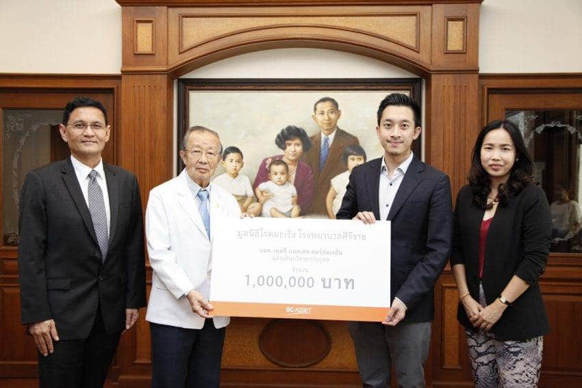 นายณัฐพงศ์ คุณากรวงศ์ ประธานเจ้าหน้าที่บริหาร บริษัท เอสซี แอสเสท คอร์ปอเรชั่น จำกัด (มหาชน)หรือ SC พร้อมกับผู้บริหาร นำเงินรายได้หลังหักค่าใช้จ่ายพร้อมกับเงินสมทบที่ได้รับการสนับสนุนจาก บริษัทคู่ค้า ผู้รับเหมาฯ และสถาบันการเงิน ร่วมกับผู้บริหารและพนักงาน จากกิจกรรมแข่งขันกอล์ฟการกุศล ครั้งที่ 10 ประจำปี2560 มอบแด่ 2 มูลนิธิ คือ มูลนิธิโรคมะเร็ง โรงพยาบาลศิริราช จำนวน1,000,000 บาท รับมอบโดย ศาสตราจารย์เกียรติคุณ นายแพทย์ไพรัช เทพมงคล กรรมการและเลขานุการมูลนิธิโรคมะเร็ง รพ.ศิริราช และ มูลนิธิสถาบันมะเร็งแห่งชาติ จำนวน 800,000 บาท รับมอบโดย นายแพทย์วีรวุฒิ อิ่มสำราญ ผู้อำนวยการสถาบันมะเร็งแห่งชาติและคุณศศชล วัชโรบล กรรมการและเลขานุการมูลนิธิสถาบันมะเร็งแห่งชาติ เพื่อสมทบทุนช่วยเหลือค่ายา ค่ารักษาส่วนเกินสิทธิแก่ผู้ป่วยโรคมะเร็งยากไร้ และเพื่อสนับสนุนกิจการเกี่ยวกับการรักษาการศึกษา วิจัยโรคมะเร็ง เมื่อเร็วๆนี้