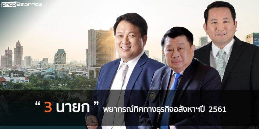 ล่วงเข้าสู่ศักราชใหม่ของปี 2561 หลายธุรกิจได้ออกมาคอมเมนต์ถึงแนวโน้มธุรกิจปีจอ “หมาทอง”เช่นเดียวกับภาคธุรกิจ “อสังหาริมทรัพย์” หนึ่งในเซกเตอร์หลักขับเคลื่อนเศรษฐกิจ ที่ล่าสุดทีมงาน prop2morrow.com ได้พูดคุยกับ 3 นายกสมาคมอสังหาริมทรัพย์ถึงแนวโน้มตลาดบ้านจัดสรรคอนโดมิเนียมในปีหน้า และมุมมอง สถานการณ์อสังหาฯ ที่ต่างก็เห็นพ้องไปในทิศทางเดียวกันว่า รอยต่อของปีที่แล้วถึงปีนี้ ยังถือว่าเป็นปีของการเปลี่ยนแปลงครั้งใหญ่ โดยผู้เล่นรายใหญ่ที่ยังครองส่วนแบ่งการตลาด พร้อมกับแห่ปั้นโปรเจกต์ยักษ์เพิ่มอุณภูมิการแข่งขันของตลาดให้ทวีความร้อนแรงยิ่งขึ้น ส่วนการร่วมทุนกับผู้ประกอบการจากต่างประเทศ จะต้องมีการศึกษาถึงข้อดี – ข้อเสียก่อนตัดสินใจ เพราะเมื่อถึงจุดๆหนึ่ง ระวัง ! อาจถูกเท