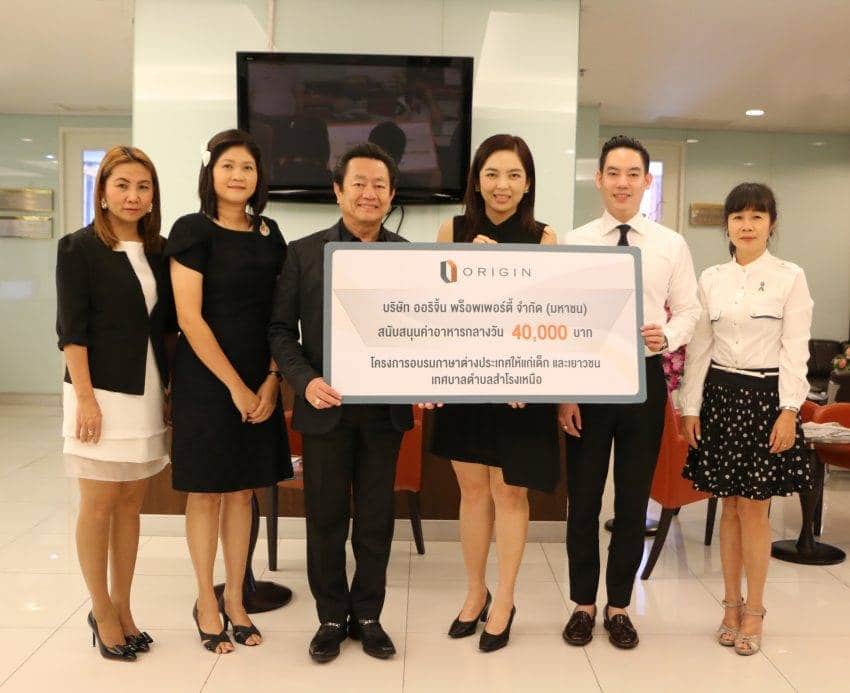 นางอารดา จรูญเอก (ที่ 3 จากขวา) ประธานเจ้าหน้าที่ปฏิบัติการ บริษัท ออริจิ้น พร็อพเพอร์ตี้ จำกัด (มหาชน) มอบเงินบริจาคจำนวน 40,000 บาท (สี่หมื่นบาทถ้วน) สนับสนุนค่าอาหารกลางวันของโครงการอบรมภาษาต่างประเทศให้แก่เด็กและเยาวชน เทศบาลตำบลสำโรงเหนือ เพื่อให้เด็กและเยาวชนมุ่งมั่นกับการพัฒนาทักษะภาษาในช่วงปิดเทอมได้อย่างเต็มที่ โดยมีนายลือกฤต เพชรบดี นายกเทศมนตรีตำบลสำโรงเหนือ (ที่ 3 จากซ้าย) และนายธนาชัย เพชรบดี รองนายกเทศมนตรีเทศบาลตำบลสำโรงเหนือ (ที่ 2 จากขวา) เป็นผู้รับมอบ