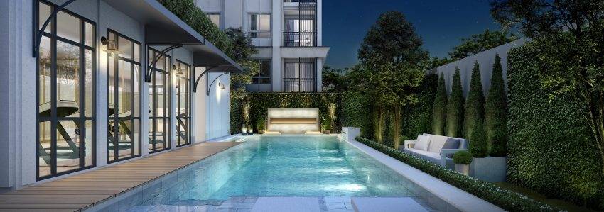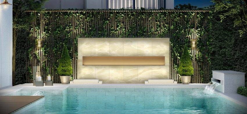 ปลายสระว่ายน้ำ ใช้หิน onxy ชนิดที่แสงส่องผ่านได้ เพื่อให้การออกแบบเป็นไปในทางเดียวกันคือ สไตล์ neo classic สำหรับด้านบนของคลับเฮาส์เป็นสวนสีเขียว ร่มรื่นเพราะได้ร่มเงาจากตัวอาคารพักอาศัยที่ช่วยบังแสงแดดให้ด้วย