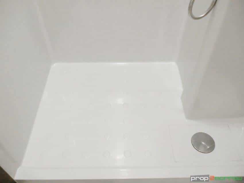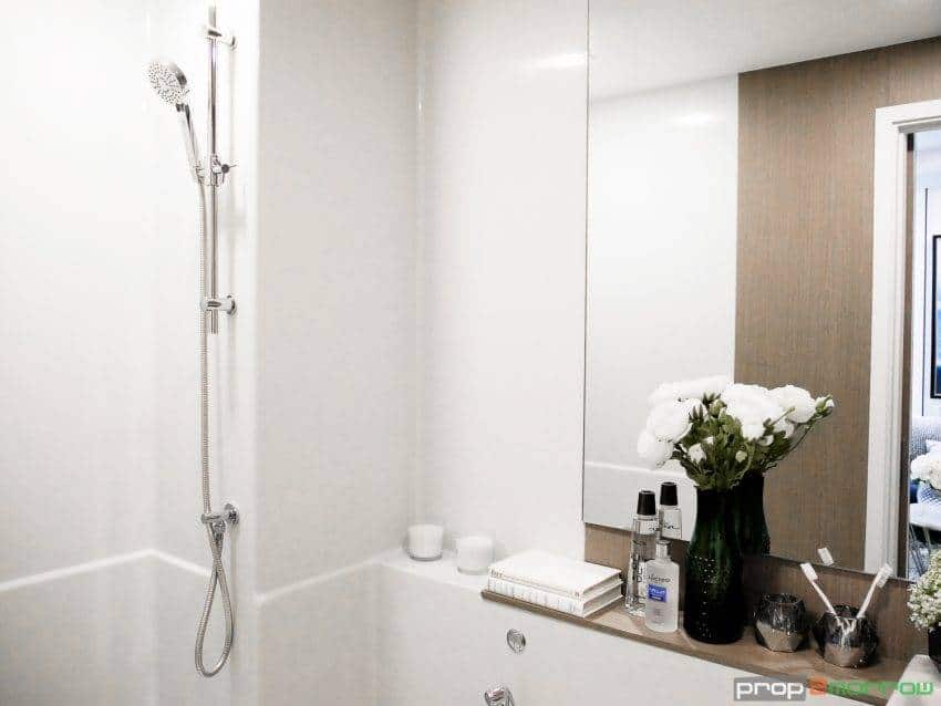 พื้นที่ยืนอาบน้ำประมาณ 1.5 x 1.5 เมตร โครงการไม่ได้ติดกระจกกั้นอาบน้ำมาให้ หากลงทุนปล่อยเช่า คุณอาจเลือกเป็นม่านพลาสติก ลดต้นทุน ราคาไม่สูงมากนัก ทำความสะอาดสะดวก ปรับเปลี่ยนง่าย