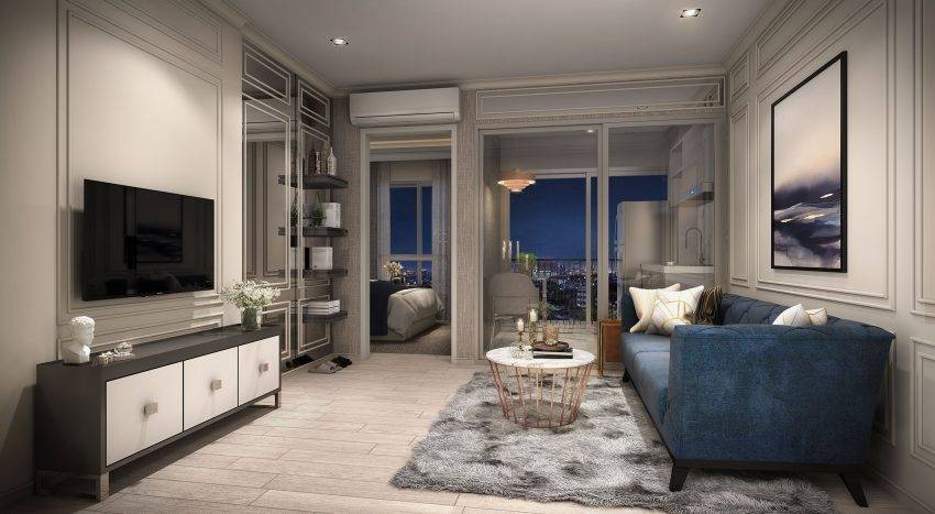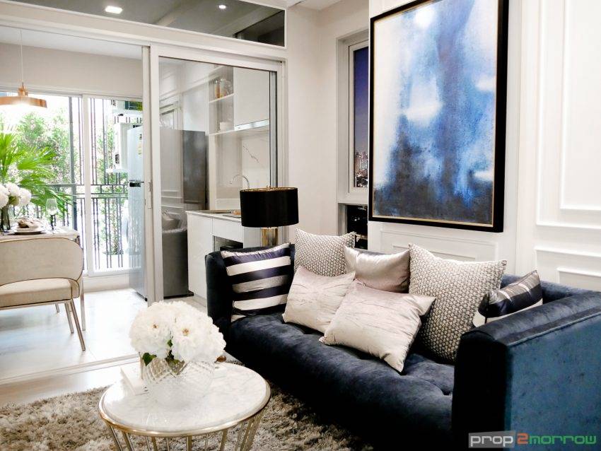 ฝั่งที่วางโซฟาจะเชื่อมกับห้องครัว กว้างพอให้วางโซฟาตัวยาวนั่งได้ 3 คนและยังสามารถวางโต๊ะเล็กๆ ให้วางนิตยสาร หรือจะเป็น Coffee table ก็ยังได้ จากในรูปเพื่อนๆ จะเห็นว่า ห้องตัวอย่าง วางโต๊ะกลางไว้เป็นไอเดีย ถ้าย้ายไปวางมุมด้านข้างๆ เพื่อนๆ อาจะเลือกซื้อโซฟาที่เป็น โซฟาเบด สามารถปรับเป็นที่นอนเวลามีแขกหรือญาติพี่น้องมาพักก็ได้ค่ะ