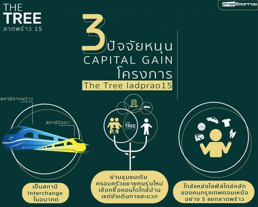 มองในมุมการลงทุน ขอเริ่มจากลงทุนแบบเก็งกำไรขายต่อก่อนนะคะ ปัจจัยหลักที่จะทำให้ราคาขึ้นคือตัวสถานีรถไฟฟ้าสายสีเหลืองที่จะมาเป็น Interchange Station กับสถานี MRT ลาดพร้าว ที่เปิดใช้งานแล้วในปัจจุบัน และความเป็นย่านชุมชนเดิมของลาดพร้าวเอง เมื่อรุ่นลูกรุ่นหลานต้องการที่อยู่อาศัยก็คงเลี่ยงไม่ได้ที่จะเลือกโครงการติดรถไฟฟ้าสะดวกกับการเดินทางเข้าเมืองเพื่อมาทำงาน แต่ก็ยังอยู้ใกล้กับบ้านหลังเดิมของครอบครัว ทั้งยังใกล้กับ 5 แยกลาดพร้าวที่เป็นย่านไลฟ์สไตล์หลักของคนกรุงเทพฯตอนเหนือ ค่อนข้างมั่นใจได้เลยว่า เดอะทรี ลาดพร้าว 15 จะมี Capital Gain ขึ้นไปในทางที่ดี