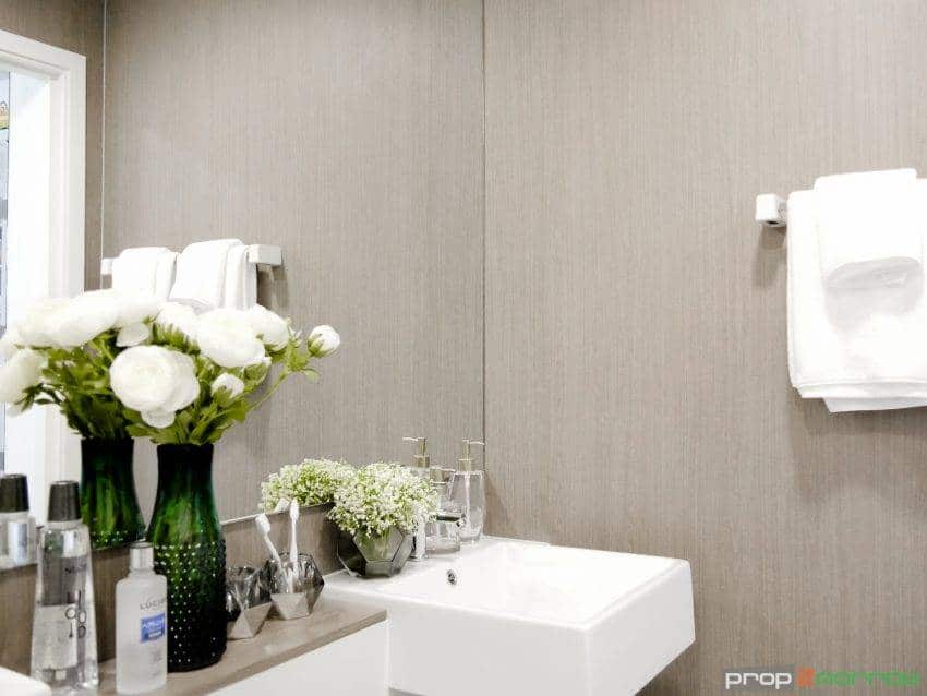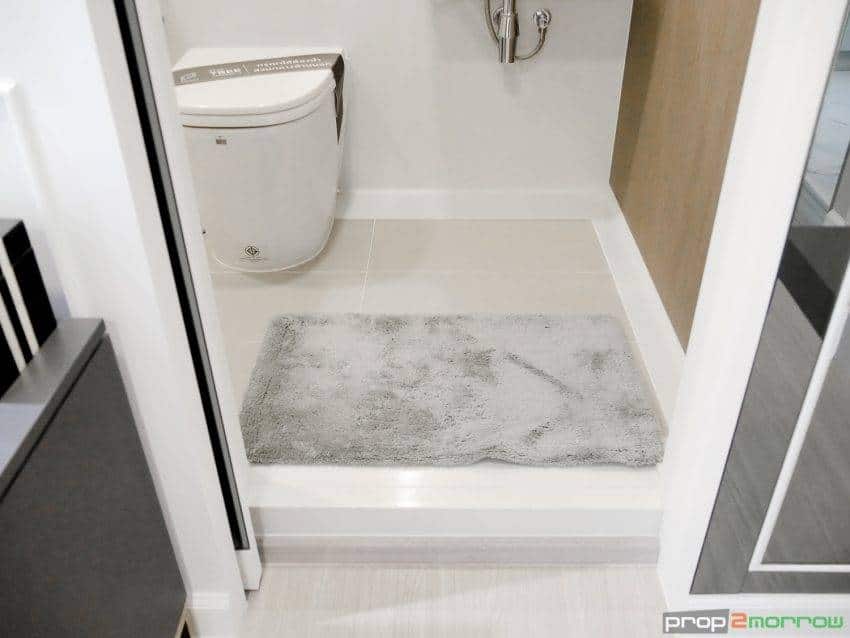 มุมที่ติดกับชั้นวางทีวี เป็นทางเข้าห้องน้ำค่ะ ห้องน้ำทุกยูนิตของโครงการเป็นห้องน้ำสำเร็จรูป จากแบรนด์ ไอดอล คิวบ์ (Aidol QUBE) เริ่มจะได้ยินกันบ่อยมากขึ้นสำหรับห้องน้ำสำเร็จรูป เป็นห้องน้ำชนิดหล่อชิ้นเดียว ไม่มีรอยต่อ ทำให้ไม่เกิดปัญหาการรั่วซึม ดีไซน์การออกแบบส่วนใหญ่แล้วจะเป็นสไตล์ยุโรป มีการติดตั้งสำเร็จทั้งสุขภัณฑ์ กระเบื้อง และระบบท่อน้ำ โดยทุกอย่างสำเร็จรูปมาจากโรงงานเลยค่ะ แล้วจึงขนส่งทั้งตู้มาติดตั้งที่โครงการ สำหรับข้อดีของห้องน้ำสำเร็จรูปแบบนี้คือ ดูแลรักษาง่าย ได้มาตรฐานเดียวกันทั้งหมด