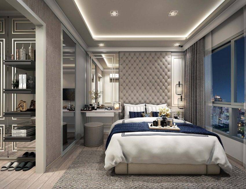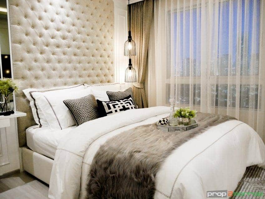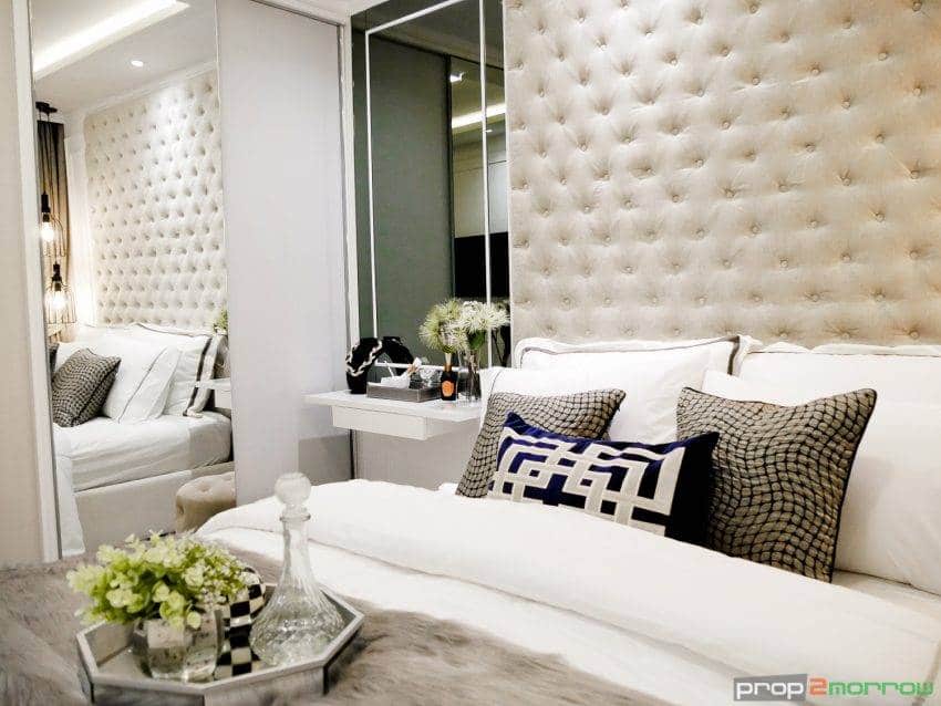 ห้องนอนวางเตียงขนาด 5 ฟุต แล้วยังเหลือพื้นที่ให้เดินได้รอบเตียง ข้อดีของห้องแบบ Fully Fitted คือสามารถเลือกเฟอร์นิเจอร์เองได้ คุณอาจเลือกเตียงสองชั้น หรือเป็น เตียงที่มีฟังก์ชันเพิ่มเติม เช่นเพิ่มลิ้นชักให้เก็บของได้อีก หรือเพิ่มลิ้นชักที่นอนก็ยังได้ จะทำให้ห้องคุณมีพื้นที่กว้างขึ้น ทำเป็นมุมอื่นได้ เช่นมุมโต๊ะเครื่องแป้ง หรือมุมทำงานมีโต๊ะเขียนหนังสือ
