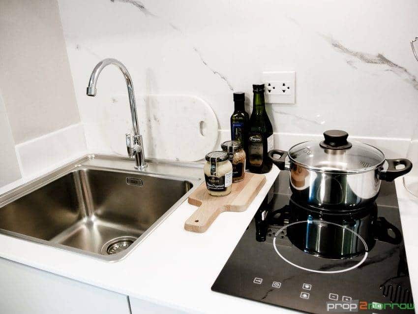 เตาไฟฟ้าเป็นเตาเซรามิคสองหัว และซิงค์ล้างจานเป็นหลุมเดี่ยวก้นลึก ก๊อกพร้อมหัวบิดแบบคันโยก โครงการเตรียมช่องปลั๊กไว้ให้ที่เคาน์เตอร์เตรียมอาหารด้วย เผื่อสำหรับเครื่องปิ้งขนมปังหรือหม้อต้มกาแฟ