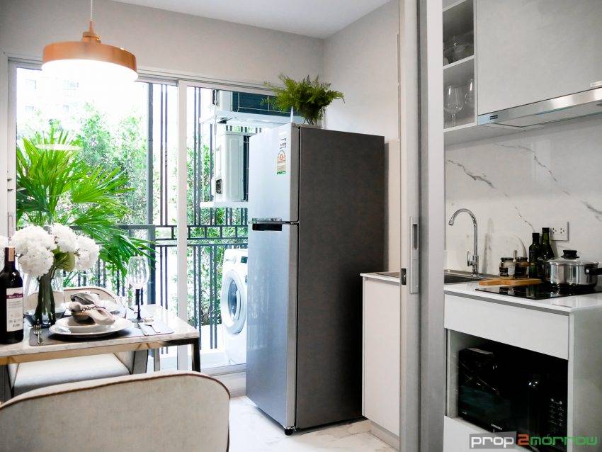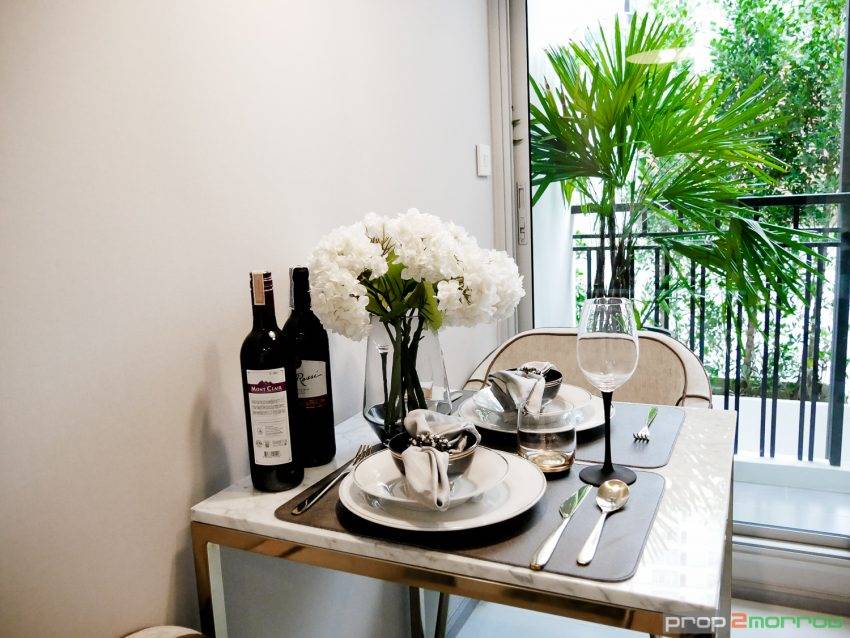 อีกฝั่งของครัวเป็นทางเดินออกไประเบียง โครงการวาง โต๊ะรับประทานอาหารไว้เป็นไอเดียในห้องตัวอย่าง คุณอาจซื้อชั้นลอยตัว หรือบิวท์อินตู้และชั้นเก็บของเพิ่ม ถ้าเป็นตู้บิวท์อินที่เพิ่มฟังก์ชั่นการใช้งานของโต๊ะรับประทานอาหารที่สามารถพับเก็บได้ จะเพิ่มพื้นที่ให้ทางเดินได้ด้วย ส่งผลให้ใช้งานทุกตารางเมตรได้อย่างคุ้มค่า