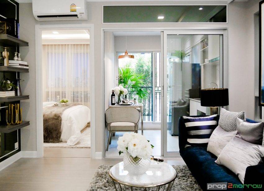 สำหรับห้องตัวอย่างที่โครงการเตรียมไว้ เป็นห้อง type 1 bedroom ขนาด 30.30 ตารางเมตรค่ะ โครงการวางฟังก์ชันการใช้งานมาค่อนข้างดีเลย เป็นห้องหน้ากว้าง ครัวปิดติดระเบียง คงจะถูกใจเพื่อนๆ ที่ชอบทำครัวไม่น้อยเลยทีเดียว ครัวแบบปิดแยกออกมาจากห้องนั่งเล่น และติดระเบียง หรือมีช่องลมให้ระบายอากาศออกไปนอกห้องได้ จำเป็นมากทีเดียวสำหรับครอบครัวคนไทย เพราะถ้าสามารถระบายอากาศจากครัวได้ จะทำให้หมดกังวลเรื่องกลิ่นอาหารที่จะติดตามเฟอร์นิเจอร์และโซฟา แต่หากใครที่ไม่ได้เน้นเรื่องการทำอาหารมากนัก ครัวแบบนี้ก็จะทำให้คุณรู้สึกเป็นระเบียบ เพราะแบ่งพื้นที่การใช้งานอย่างชัดเจนค่ะ