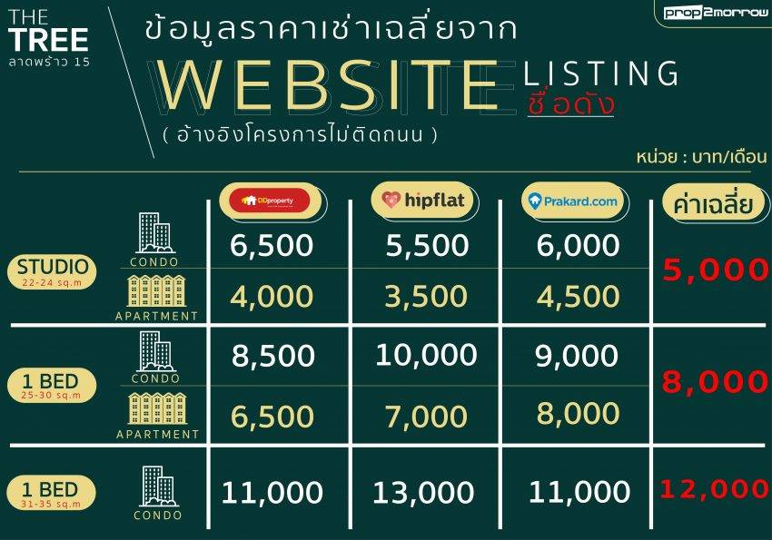 สำหรับ Yield ค่าเช่า เปรียบเสมือน น้ำจิ้มของอาหารจานหลัก เก็บกินไปเรื่อยๆก่อนจะขายเอา Capital Gain ในอนาคต ซึ่ง P2M สรุปข้อมูลราคาเฉลี่ยค่าเช่า อพาร์ทเม้นท์และคอนโด ละแวกย่านลาดพร้าว มาให้เพื่อนๆ แล้วค่ะ อ้างอิงจาก 3 เว็บไซต์นะคะ ตาม graphic ข้างล่างเลยจ้า