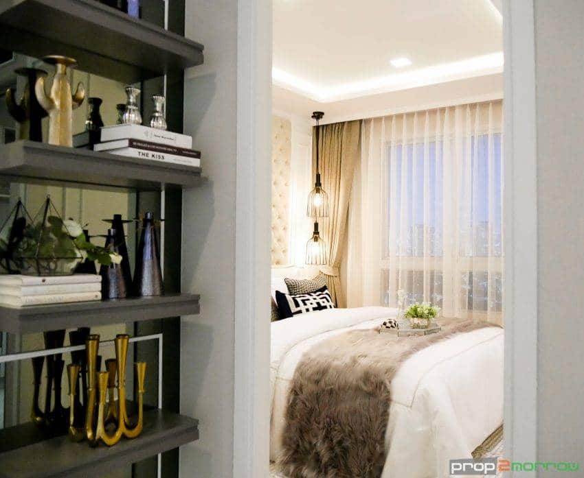 สุดท้ายมาที่ห้องนอนค่ะ บริเวณทางเข้า จะมีมุมเล็กๆ ซึ่งห้องตัวอย่างให้ไอเดีย เพิ่มชั้นวางของ ถ้าเพิ่มเป็นตะขอแแขวน สำหรับห้อยกุญแจบ้าน หรือกระเป๋าใบที่ใช้บ่อยๆ ก็ได้ค่ะ หรืออาจบิวท์อินท์ชั้นวางรองเท้าเพิ่ม ติดกระจกเงาบริเวณนี้เพิ่มซักบาน จะทำให้คุณเช็คได้ความเรียบร้อยก่อนจากบ้าน และยังทำให้บ้านดูกว้างขึ้นด้วยนะคะ