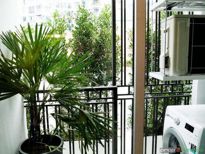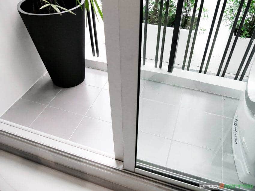 แบ่งพื้นที่ระเบียงกับครัวกั้นด้วยพื้นที่ยกธรณีประตูขึ้นมาประมาณ 10 เซนติเมตร และกระจกใสบานเลื่อน 2 ตอน ระเบียงปูกระเบื้องเนื้อหยาบสีเทา กว้างพอให้วางเครื่องซักผ้าได้ ยังเหลือที่ให้ตากผ้า ส่วนคอมเพรซเซ่อร์แอร์ 2 ตัว แขวนด้านบนเครื่องซักผ้าหันหน้าออก ทำให้ความร้อนไม่ถูกพัดเข้ามาในห้อง