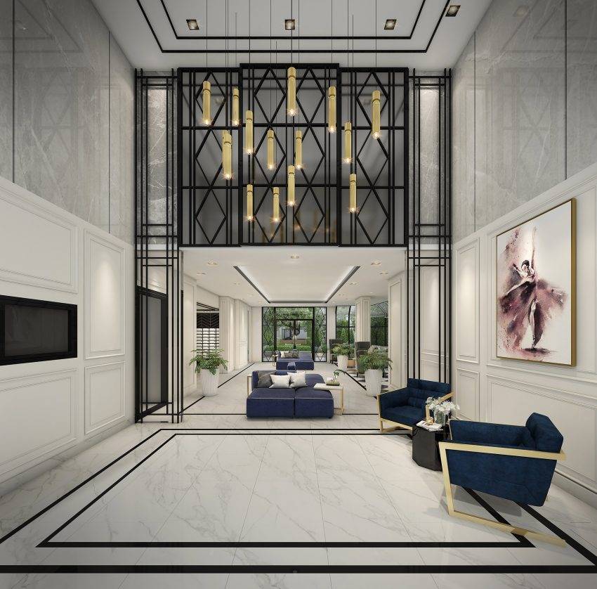 ที่บริเวณพื้นของโถง Lobby ด้านในอาคารคงความเป็นสไตล์ neo classic โดยใช้หินอ่อน White Carara เป็นหินอ่อนที่ให้ความเงางามมากกว่าหินอ่อนชนิดอื่นๆ รวมทั้งเพิ่มความโอ่งโถงและหรูหรา ด้วยการยกเพดานสูง ให้เป็น Double Floor สูงถึง 5 เมตร ทำให้เกิดความรู้สึกที่ กว้างขึ้น ใหญ่ขึ้น โดยใช้พื้นที่เท่าเดิม