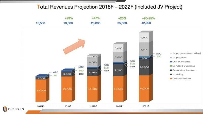 หากพิจารณาถึงข้อมูลที่ได้แจ้งไปยังตลาดหลักทรัพย์ฯเห็นชัดเจนว่า “ออริจิ้น”เปิดเกมส์รุกธุรกิจมากขึ้นวางโรดแมปประมาณการด้านรายได้ (Revenues)ยาว 5 ปี (ปี2561- 2565) ถึง 42,000 ล้านบาท (Included JV Project) จากปี 2561 ที่ตั้งเป้ารายได้ไว้ที่ 15,500 ล้านบาท