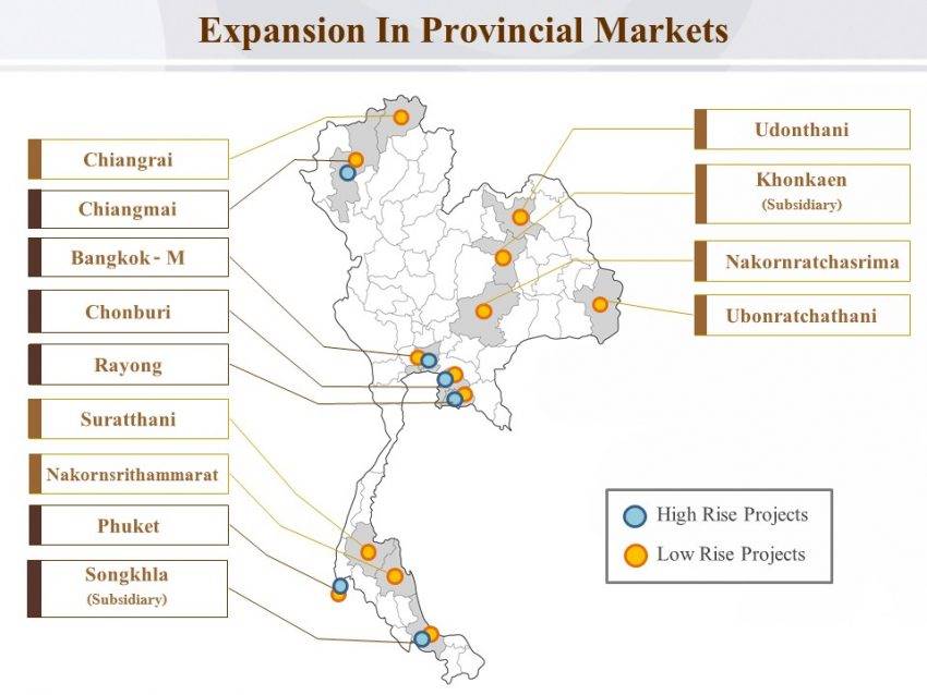 โดยการเข้าไปลงทุนในแต่ละจังหวัดจะต้องมีการพัฒนา 3 โครงการขึ้นไป จะมีเพียงจังหวัดชลบุรี เชียงใหม่ ภูเก็ต และสงขลา ที่พัฒนามากถึง 9-10 โครงการ และทุกจังหวัดที่บริษัทฯเข้าไปพัฒนา ล้วนประสบความสำเร็จเป็นอย่างดี และขณะนี้บริษัทฯยังมีที่ดินสะสมอยู่อีก 4 จังหวัดที่ยังไม่ได้นำมาพัฒนา ซึ่งในอนาคตมีแผนที่จะนำมาพัฒนาที่อยู่อาศัยสำหรับดีมานด์ในท้องถิ่น ได้แก่ ที่ดินที่ จ.พระนครศรีอยุธยา ที่ซื้อมาเกือบ 30 ปีแล้ว บริเวณข้างรพ.บางไทร จำนวนกว่า 40 ไร่ แต่ก็ยังไม่มีศักยภาพเพียงพอในการพัฒนา ,ที่ดินที่จ.ลำพูน ซื้อมาเมื่อกว่า 1 ปีที่ผ่านมา พื้นที่40-50 ไร่,ที่ดินที่อ.ชะอำ จ.เพชรบุรี ซื้อมายังไม่ถึงครึ่งปี และที่ดินที่จ.ประจวบคีรีขันธ์ ซึ่งซื้อมาเมื่อ 1-2 ปีที่ผ่านมา บนพื้นที่ 3-5 ไร่ ซึ่งมีศักยภาพที่จะพัฒนาได้ทั้งในรูปแบบตอนโดฯและทาวน์เฮาส์ ได้ แต่ที่ดินทั้ง 4 จังหวัด ยังไม่เพียงพอที่จะพัฒนา คงต้องมีการรวบรวมซื้อที่ดินเพิ่มมากขึ้น
