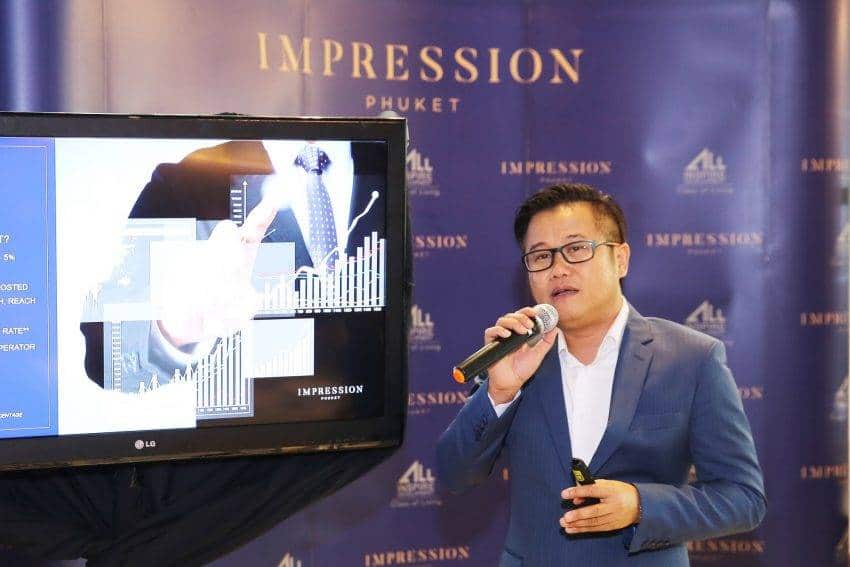 สำหรับที่ราคาที่ดินในภูเก็ตนับวันราคาจะพุ่งสูงขึ้นอย่างต่อเนื่อง เพราะดีมานด์ทั้งชาวไทยและต่างชาติมีเพิ่มมากขึ้นทุกปี จึงมีผู้ประกอบการเข้าไปพัฒนาโครงการเป็นจำนวนมาก โดยปัจจุบันราคาที่ดินย่านป่าตองพุ่งสูงไปถึง 200 ล้านบาท/ไร่ ส่วนย่านอ่าวฉลองราคาก็สูงไม่แพ้กันสูงถึง 150 ล้านบาท/ไร่ ดังนั้นเพื่อเป็นการรองรับการเติบโตด้านการท่องเที่ยวและการพัฒนาอสังหาริมทรัพย์ ล่าสุด บริษัทฯจึงได้เปิดตัว โครงการ “อิมเพรสชั่น ภูเก็ต” (Impression Phuket ) ตั้งอยู่บริเวณอ่าวฉลอง บนพื้นที่กว่า 5 ไร่ ซึ่งบริษัทฯได้ซื้อที่ดินแปลงดังกล่าวมาเมื่อปี2560 ที่ผ่านมา พัฒนาในรูปแบบของลักชัวรี่ เรสซิเดนซ์ ขนาดตั้งแต่ 113-302.5 ตารางเมตร จำนวน 42 ยูนิต ราคาเริ่มต้นที่ 25-80 ล้านบาท มูลค่าโครงการกว่า 1,600 ล้านบาท เน้นกลุ่มเป้าหมายที่เป็นนักลงทุนไฮเอนด์ทั้งคนไทยและต่างชาติ โดยได้เปิดขายในเฟสแรกก่อน ซึ่งมีแผนจะเปิดตัวในเดือนพฤษภาคมนี้ แต่ขณะนี้มีลูกค้าชาวไทยให้ความสนใจห้องเพนท์เฮาส์แล้ว 7 ยูนิต มูลค่า 560 ล้านบาท จากเพนท์เฮาส์ทั้งหมด 8 ยูนิต และในช่วงสัปดาห์นี้จะมีลูกค้าคนไทย ที่ดำเนินธุรกิจสัมปทานรังนก สนใจซื้อ 3 ยูนิต มูลค่า 150 ล้านบาท ส่วนเฟสที่2 คาดว่าจะเปิดขายในช่วงไฮ ซีซั่น ปลายปี2561 นี้ คาดว่าในปีนี้จะสามารถสร้างยอดจองได้กว่า 70% ด้านการก่อสร้างจะเริ่มดำเนินการในเดือนกันยายน 2561 และจะแล้วเสร็จภายในไตรมาส 3 ปี 2562 นี้