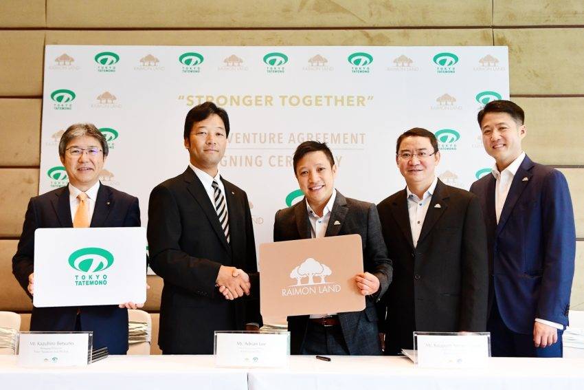 นายเอเดรียน ลี (ที่ 3 จากซ้าย) ประธานเจ้าหน้าที่บริหาร พร้อมด้วยคณะผู้บริหาร บริษัท ไรมอน แลนด์ จำกัด(มหาชน)หรือ RML ถ่ายภาพร่วมกับมร.คะทสึฮิโตะ โอซะวะ (ที่ 1 จากซ้าย) กรรมการ ประธานเจ้าหน้าที่บริหาร และหัวหน้าฝ่ายธุรกิจต่างประเทศ และมร.คะซุฮิโระ เบทซึเนะ กรรมการผู้จัดการ (ที่ 2 จากซ้าย) บริษัท โตเกียว ทาเทโมโนะ จำกัด ในโอกาสลงนามร่วมทุนพัฒนาโครงกา รคอนโดมิเนียม ระดับไฮเอนด์ 2 โครงการแรก โดยไรมอน แลนด์ ถือหุ้นในสัดส่วน 51% และโตเกียว ทาเทโมโนะ เอเชีย บริษัทในเครือของ โตเกียว ทาเทโมโนะ ในส่วนของธุรกิจต่างประเทศ ถือหุ้นในสัดส่วน 49% เมื่อเร็วๆ นี้ ณ โรงแรมดับเบิ้ลยู กรุงเทพ