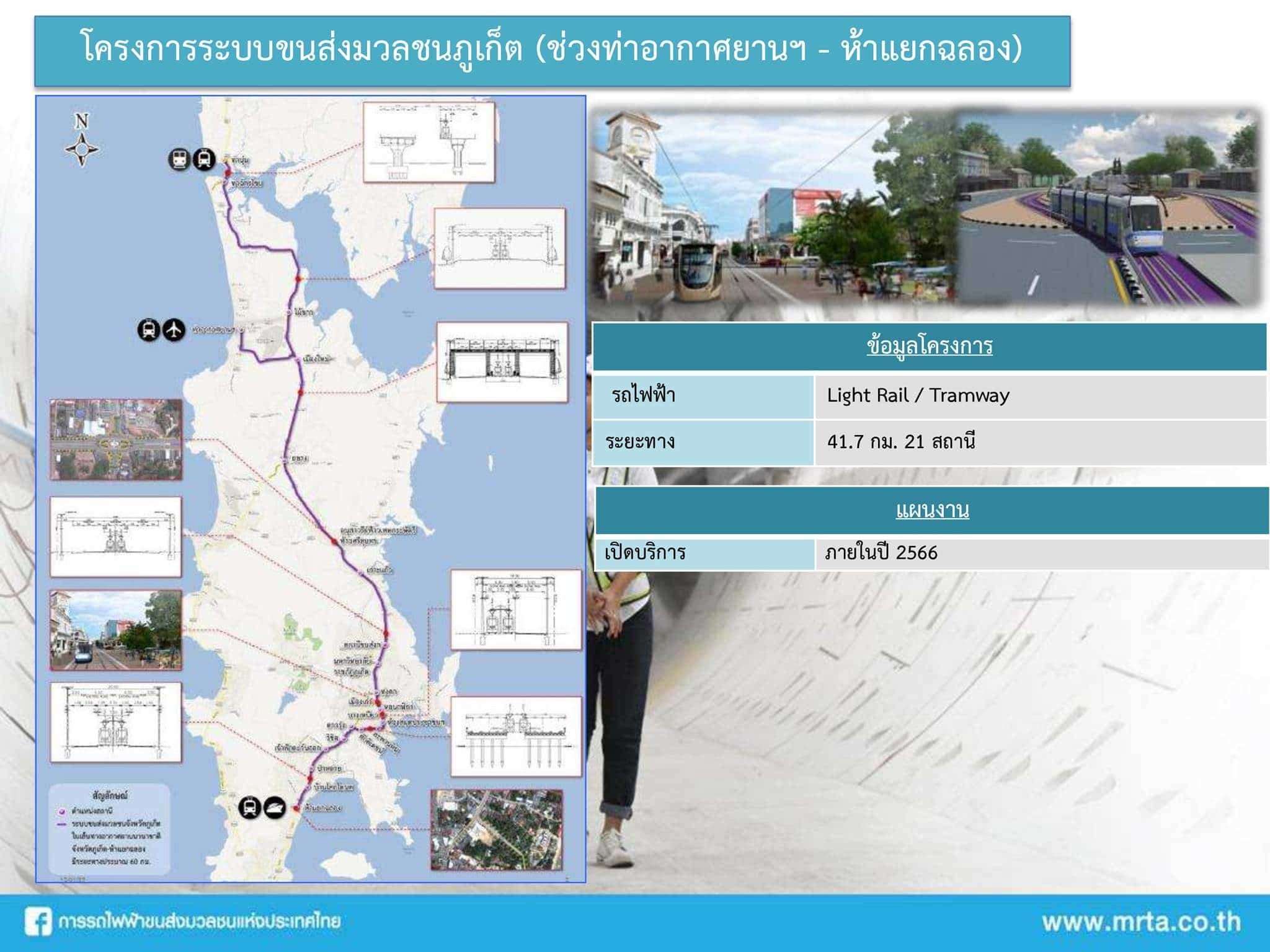 ทั้งนี้ โครงการระบบขนส่งมวลชนจังหวัดภูเก็ต เป็นระบบรถไฟฟ้ารางเบา (Light Rail Transit หรือ Tramway) มีจุดเริ่มต้นโครงการอยู่บริเวณรถไฟท่านุ่น จังหวัดพังงา เพื่อเชื่อมต่อการเดินทางจากระบบรถไฟ และมีจุดสิ้นสุดโครงการอยู่ทางเหนือของห้าแยกฉลอง จังหวัดภูเก็ต (บนถนนเจ้าฟ้าตะวันออก ห่างจากห้าแยกฉลองประมาณ 200 เมตร) มีสถานีจำนวน 24 สถานี รวมระยะทางประมาณ 58.5 กิโลเมตร มีมูลค่าการลงทุนทั้งโครงการประมาณ 39,406 ล้านบาท