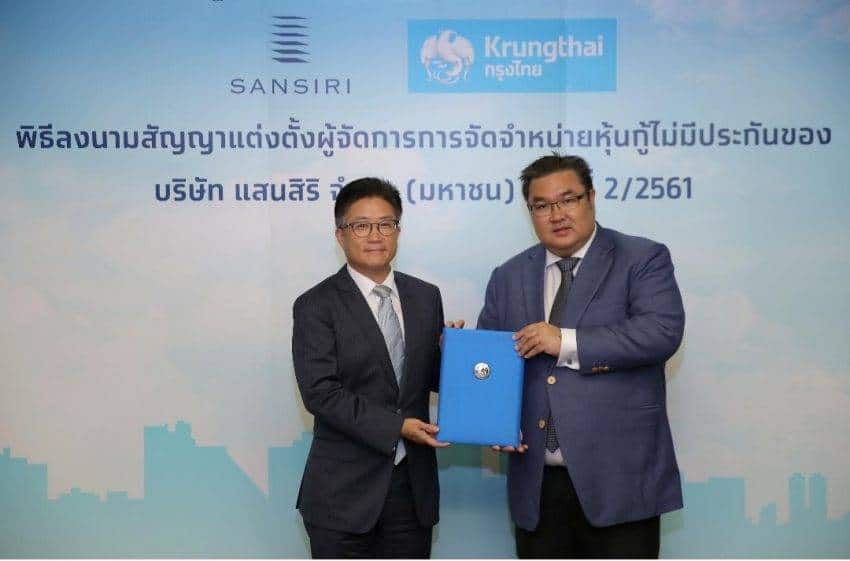 นายวันจักร์ บุรณศิริ ประธานผู้บริหารสายงานการเงินและสนับสนุนธุรกิจ บริษัท แสนสิริจำกัด (มหาชน) หรือSIRI (ซ้ายมือ) ร่วมด้วยนายรวินทร์ บุญญานุสาสน์ ผู้ช่วยกรรมการผู้จัดการใหญ่ อาวุโส ผู้บริหารสายงานธุรกิจตลาดเงิ นตลาดทุน ธนาคารกรุงไทย จำกัด(มหาชน) (ขวามือ) พร้อมคณะผู้บริหาร ร่วมลงนามแต่งตั้งผู้จัดการการจัดจำหน่ายหุ้นกู้ไม่มีประกันของแสนสิริ ครั้งที่ 2/2561 จำนวน 2,000 ล้านบาท มีอายุ 3 ปี 6 เดือน อัตราดอกเบี้ย 3% ต่อปี อันดับความน่าเชื่อถือของหุ้นกู้ ในระดับ BBB+ จำหน่ายผ่านธนาคารกรุงไทยทุกสาขาทั่วประเทศ แบ่งการเสนอขายเป็น 3 รอบ ได้แก่ รอบที่ 1 ตั้งแต่วันที่ 17-18 พฤษภาคม 2561 เสนอขายแก่ผู้ถือหุ้นกู้ SIRI185A รอบที่ 2 ตั้งแต่วันที่ 22-23 พฤษภาคม 2561 เสนอขายให้แก่ผู้ถือหุ้นกู้ของแสนสิริทุกรุ่น และรอบที่ 3 ตั้งแต่วันที่ 25 และ 28 พฤษภาคม 2561 เสนอขายให้แก่ผู้ลงทุนทั่วไปและผู้ลงทุนสถาบัน โดยการเสนอขายหุ้นกู้ครั้งนี้ บริษัทฯ มีแผนนำเงินเพื่อไปใช้ ในการชำระคืนหุ้นกู้ที่จะถึงกำหนดชำระและเป็นเงินทุนหมุนเวียนในการดำเนินกิจการของบริษัท