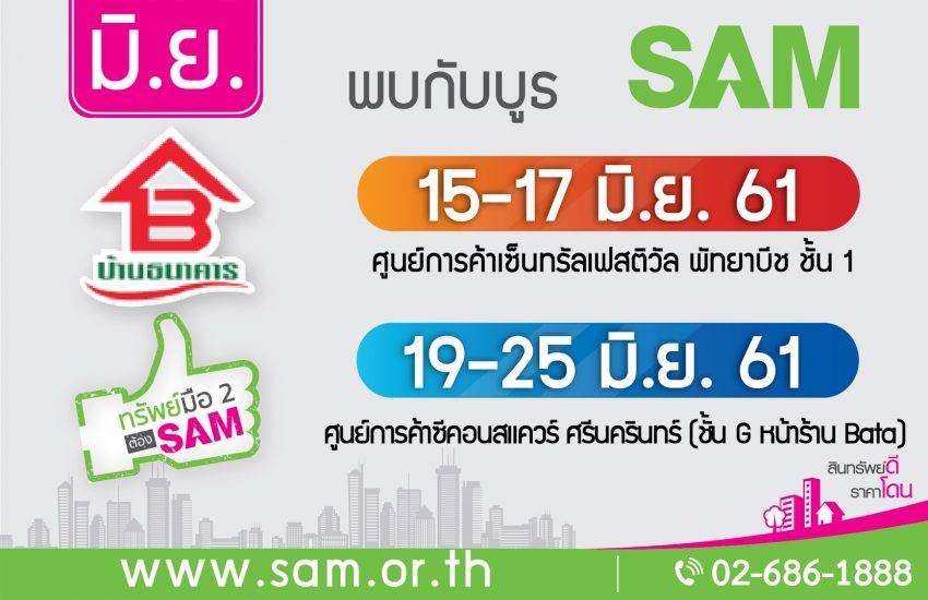 และ 2. งาน “ทรัพย์มือสองต้อง SAM ครั้งที่ 3” ระหว่างวันที่ 19-25 มิถุนายนตั้งแต่เวลา 10.00-20.00 น. บริเวณชั้น G ศูนย์การค้า ซีคอนสแควร์ ถ.ศรีนครินทร์ กรุงเทพฯ โดยมีทรัพย์ที่น่าสนใจหลายรายการ อาทิ ทาวน์เฮาส์ เนื้อที่ 26 ตารางวา ราคา 4.69 ล้านบาท และบ้านแฝด เนื้อที่ 35 ตารางวา เขตประเวศ ราคา 2.49 ล้านบาท บ้านเดี่ยว เนื้อที่ 81 ตารางวา อ.บางพลี จ.สมุทรปราการราคา 4.19 ล้านบาท ทาวน์เฮาส์ เนื้อที่ 36 ตารางวา กลางเมืองสมุทรปราการ ราคา 3.39 ล้านบาท เป็นต้น