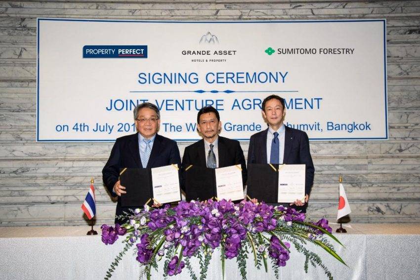 นายชายนิด อรรถญาณสกุล ประธานเจ้าหน้าที่บริหาร บริษัท พร็อพเพอร์ตี้ เพอร์เฟค จำกัด (มหาชน)หรือPF (ซ้าย) นายวิทวัส วิภากุล ประธานเจ้าหน้าที่บริหาร ธุรกิจอสังหาริมทรัพย์ ประธานเจ้าหน้าที่บริหาร ธุรกิจอสังหาริมทรัพย์ บริษัท แกรนด์ แอสเสท โฮเทลส์ แอนด์ พรอพเพอร์ตี้ จำกัด(มหาชน)หรือ GRAND (กลาง)ได้ร่วมลงนามในสัญญาความร่วมมือร่วมกับ นายทัตสึโอะ อิวางาคิ กรรมการผู้จัดการ บริษัท ซูมิโตโม ฟอเรสทรี (สิงคโปร์) จำกัด (ขวา) พัฒนาโครงการคอนโดมิเนียมระดับไฮเอนด์ ริมแม่น้ำเจ้าพระยา ถนนเจริญนคร บนพื้นที่กว่า 8 ไร่ มูลค่าโครงการประมาณ 10,000 ล้านบาท กำหนดเปิดตัวโครงการและเริ่มก่อสร้างในปี 2562 คาดว่าโครงการจะแล้วเสร็จในปี 2566