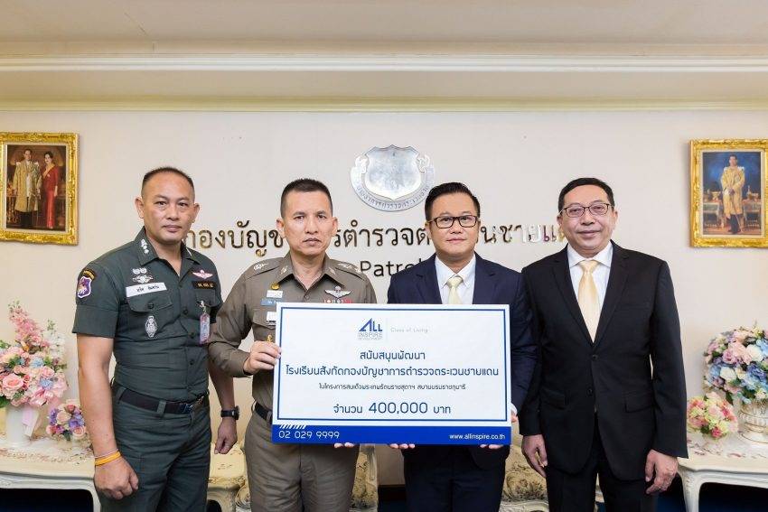เมื่อเร็วๆนี้ นายธนากร ธนวริทธิ์ (ที่ 3 จากซ้าย) ประธานเจ้าหน้าที่บริหาร บริษัท ออลล์ อินสไปร์ ดีเวลลอปเม้นท์ จำกัด (มหาชน) ผู้ประกอบการอสังหาริมทรัพย์รูปแบบคอนโดมิเนียมภายใต้แบรนด์ ดิ เอ็กเซล ไรส์ และอิมเพรสชั่น ตระหนักถึงความสำคัญของการพัฒนา คุณภาพชีวิต การศึกษา ตลอดจนสุขภาพอนามัยของเยาวชน และชุมชนในพื้นที่ทุรกันดาร ด้วยการมอบเงินสนับสนุน จำนวนเงิน 400,000 บาท แก่ พล.ต.ต. วิชิต ปักษา (ที่ 2 จากซ้าย) รองผู้บัญชาการตำรวจตระเวนชายแดน โดยมีจุดมุ่งหมายสนับสนุนพัฒนาโรงเรียนสังกัดตำรวจตระเวนชายแดน ในโครงการสมเด็จพระเทพรัตนราชสุดาฯ สยามบรมราชกุมารี ณ กองบัญชาการตำรวจตระเวนชายแดน