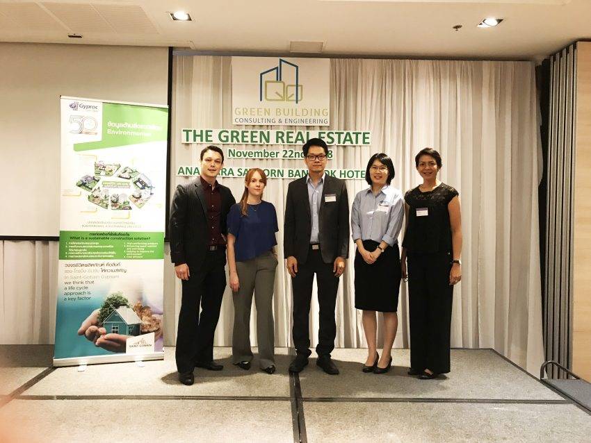 นายสมพันธ์ ลีลาปัญญาภรณ์ (ที่ 3 จากซ้าย) ผู้จัดการกลุ่มผลิตภัณฑ์ แซง-โกแบ็ง ยิปรอค และวอน ซิ่ว ยี่ (ที่ 4 จากซ้าย) ผู้จัดการฝ่ายกลยุทธ์การตลาด พร้อมด้วย เอมิลี เลอ บิออง (ที่ 2 จากซ้าย) ผู้ก่อตั้งและประธานเจ้าหน้าที่บริหาร กรีน บิ้วดิ้ง คอนซัลแทนท์แอนด์เอ็นจิเนียริ่ง ถ่ายภาพร่วมกันในงาน Green Real Estate ซึ่งจัดขึ้นเพื่อการแลกเปลี่ยนองค์ความรู้ในการสร้างสรรค์อนาคตของวงการอสังหาริมทรัพย์ในภูมิภาคอาเซียนอย่างยั่งยืน พร้อมนำเสนอนวัตกรรมแผ่นยิปซัม Gyproc® Activ’ Air แก่ผู้เข้าร่วมชมงาน ณ โรงแรมอนันตรา สาทร กรุงเทพฯ