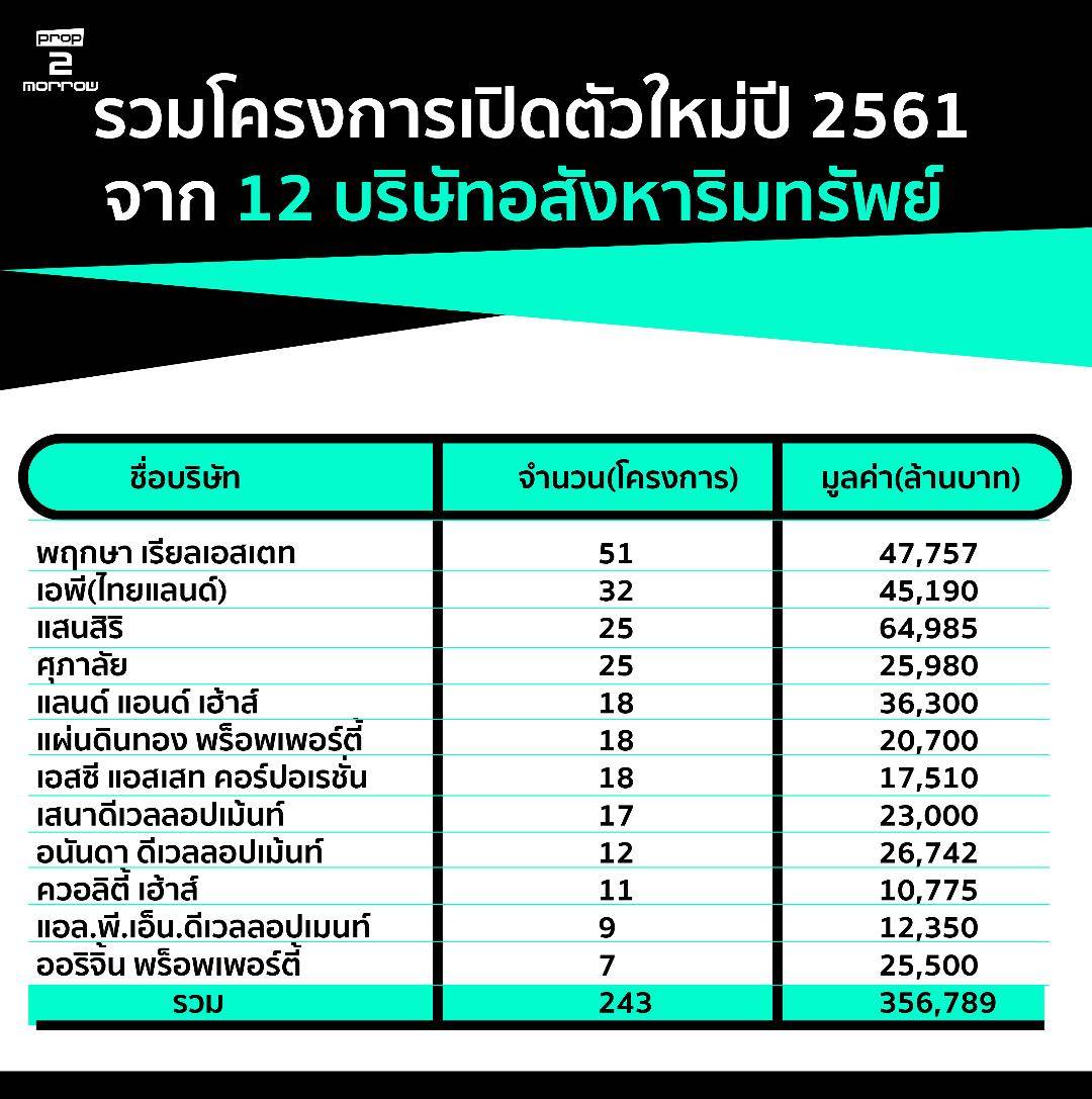 จากการสำรวจข้อมูล 12 บริษัทที่จดทะเบียนในตลาดหลักทรัพย์แห่งประเทศไทย ในการเปิดตัวโครงการใหม่ปี 2561 พบว่ามีจำนวนรวมทั้งสิ้น 243 โครงการ รวมมูลค่า 356,789 ล้านบาท โดยบริษัท พฤกษา เรียลเอสเตท จำกัด(มหาชน)หรือ PS มีการเปิดตัวโครงการมากที่สุด จำนวน 51 โครงการ ในขณะที่บริษัท แสนสิริ จำกัด(มหาชน) หรือ SIRI แม้จะมีการเปิดตัวใหม่เพียง 25 โครงการ เป็นอันดับ 3 เท่ากับบริษัท ศุภาลัย จำกัด(มหาชน)หรือ SPALI แต่มีมูลค่าที่มากเป็นอันดับ 1 คือที่ 64,985 นั่นเป็นเพราะแสนสิริฯมีการพัฒนาโครงการบ้านเดี่ยว ระดับซูเปอร์ลักชัวรี่ มูลค่าโครงการกว่า 3,000 ล้านบาท ขณะที่บริษัท ออริจิ้น พร็อพเพอร์ตี้ จำกัด(มหาชน)หรือ ORI มีการเปิดตัวน้อยที่สุด จำนวน 7 โครงการ แต่บริษัท ควอลิตี้ เฮ้าส์ จำกัด(มหาชน)หรือ QH แม้ว่าจะมีการเปิดตัวถึง 11 โครงการ แต่มูลค่าโครงการกลับน้อยที่สุดจาก 12 บริษัท คืออยู่ที่ 10,775 ล้านบาท แต่โดยภาพรวมแล้วหลายค่ายมีการเปิดตัวโครงการและมูลค่ารวมมากกว่าปี 2560
