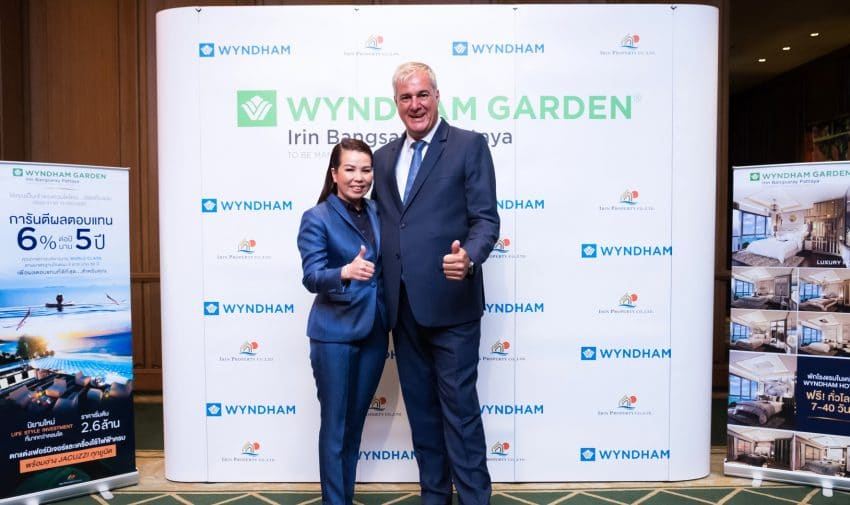 นางไอริณรยา พัฒนวิรนนท์ กรรมการบริหาร บริษัท ไอริณ พร็อพเพอร์ตี้ จำกัด(ซ้าย) ร่วมกับ มร. เดวิด เรย์ รองประธาน ฝ่ายพัฒนาโครงการ วินด์ดัม โฮเทลส์ แอนด์ รีสอร์ทส์ แถลงข่าวเปิดตัว “วินด์แฮม การ์เด้น ไอริณ บางเสร่ พัทยา” คอนโดหรูเพื่อการลงทุน 100% ด้วยสไตล์โลว์ไรส์ สไตล์โมเดิร์น ลักชัวรี่ ย่านบางเสร่ พัทยา ชูจุดขายผลตอบแทน 6% 5 ปีแรก ผลตอบแทนในรูปแบบการลงทุนธุรกิจโรงแรมระยะยาวถึง 30 ปี และพร้อมให้สิทธิประโยชน์สำหรับลูกค้าที่ซื้อโครงการ ในการพักผ่อนฟรีปีละ 7- 40 วัน / ปี สามารถเลือกพักในโรงแรมเครือ “WYNDHAM” ทั่วโลกฟรี นานถึง 35 ปี และพักในเครือ Irin ได้ฟรี ถึง 7 วัน/ ปี นานถึง 5 ปีแรก งานดังกล่าวจัดขึ้น ณ โรงแรม แกรนด์ ไฮแอท เอราวัณ กรุงเทพฯ เมื่อเร็วๆ นี้
