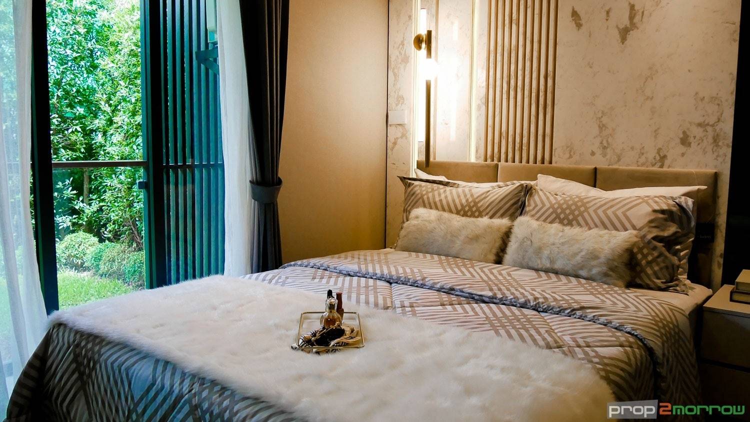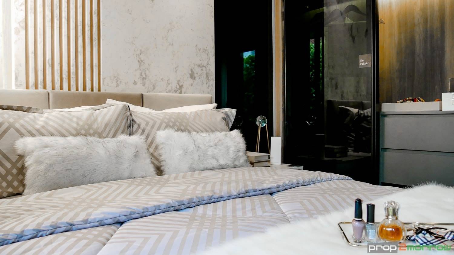 ภายในห้องแบ่งพื้นที่ระหว่าง Living Area และห้องนอนด้วยกระจกบานสไลด์ แบ่งพื้นที่เป็นสัดส่วนตามความต้องการใช้งาน หากอยู่อาศัยกัน 2 คน คนหนึ่งอยากดูทีวี แต่อีกคนอยากนอนก็เลื่อนบานสไลด์แบ่งสัดส่วนกัน กันเสียงทีวีรบกวน