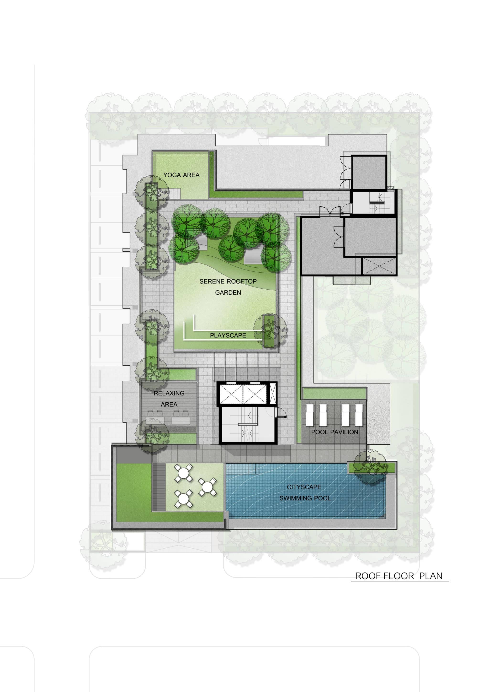 ชั้นดาดฟ้า:Relaxing Area, Cityscape Swimming Pool, Pool Pavilion, Yoga Area, Serene Rooftop Garden,Playscape