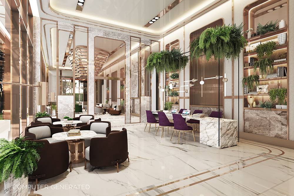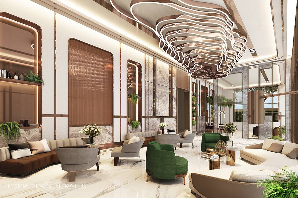 Grand Lobby ที่ตกแต่งด้วย Sculpture Chandelier ซึ่งสั่งทำพิเศษ โดยได้แรงบันดาลใจการออกแบบจาก รูปทรงของเนินเขากับเส้นสายของคลื่นในทะเล ด้วยโทนสี Rose Gold ที่คล้ายช่วงเวลาพระอาทิตย์กำลังตกดิน และจุดที่สูงที่สุดของส่วน Grand Lobby สูงถึง 6 เมตร