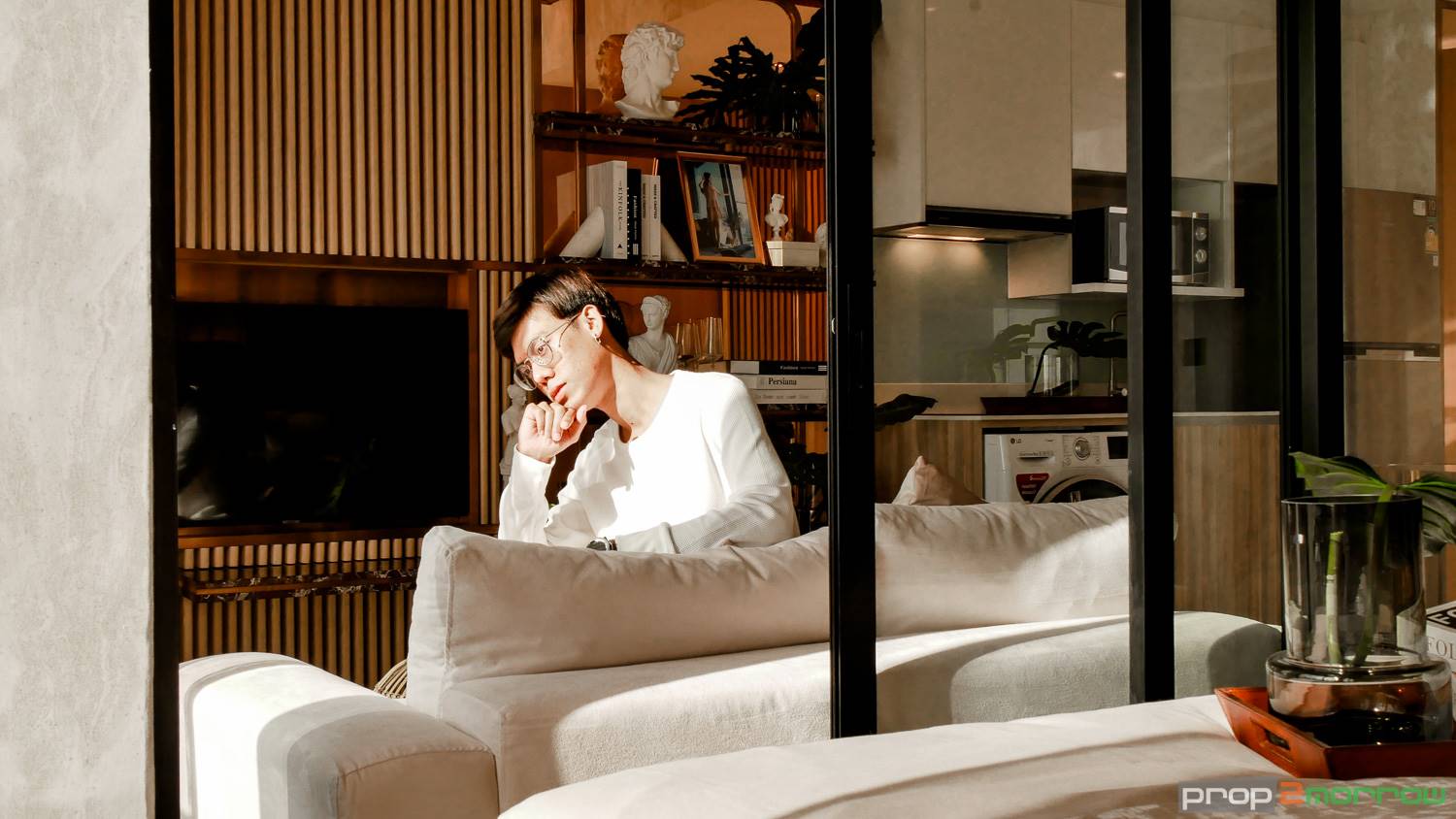 เข้าไปด้านในเป็นส่วนของห้องนั่งเล่น แบ่งพื้นที่กับห้องนอนโดยใช้กระจกบานสไลด์ ของดีของการใช้บานสไลด์ในการแบ่งพื้นที่คือ หากอยากใช้พื้นที่กว้างๆ ก็เปิดบานสไลด์ หรือเวลามีเพื่อนมาเล่นที่บ้าน และอยากได้ความเป็นส่วนตัวก็แค่ปิดบานกระจกสไลด์ก็ได้ความเป็นส่วนตัวแล้ว สามารถเลือกใช้ได้ตามความต้องการเลย แนะนำนิดนึง บานกระจกสไลด์ที่ทางโครงการให้เป็นแบบใส หากอยากได้ความเป็นส่วนตัวอาจจะติดผ้าม่านเพิ่ม หรือติดกระจกเป็นแบบทึบเพื่อให้ได้ความเป็นส่วนตัว