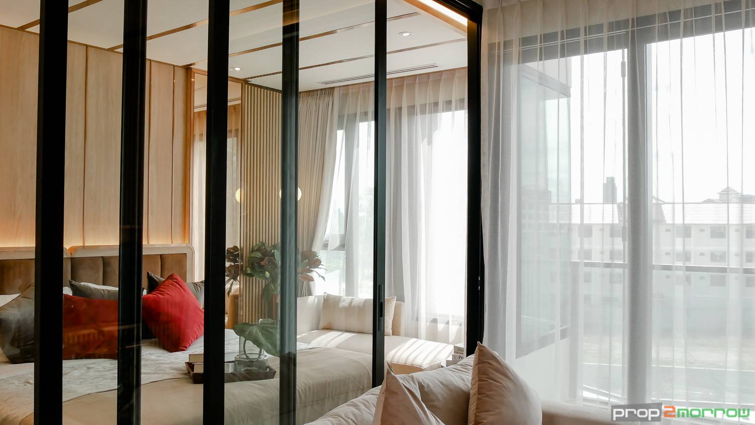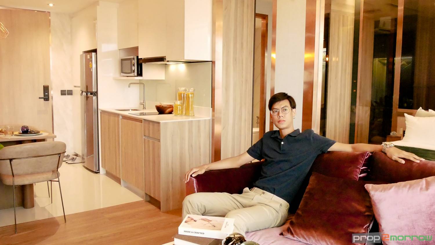 ห้อง 1 ห้องนอน ขนาด 34.40 ตารางเมตร ทางโครงการออกแบบวาง Layout ห้อง และแบ่งพื้นที่การใช้งานโดยใช้กระจกกั้นแบ่งพื้นที่ระหว่างส่วนครัว ห้องนั่งเล่น และห้องนอนก็มีกระจกบานสไลท์กั้น เพื่อความเป็นสัดส่วน