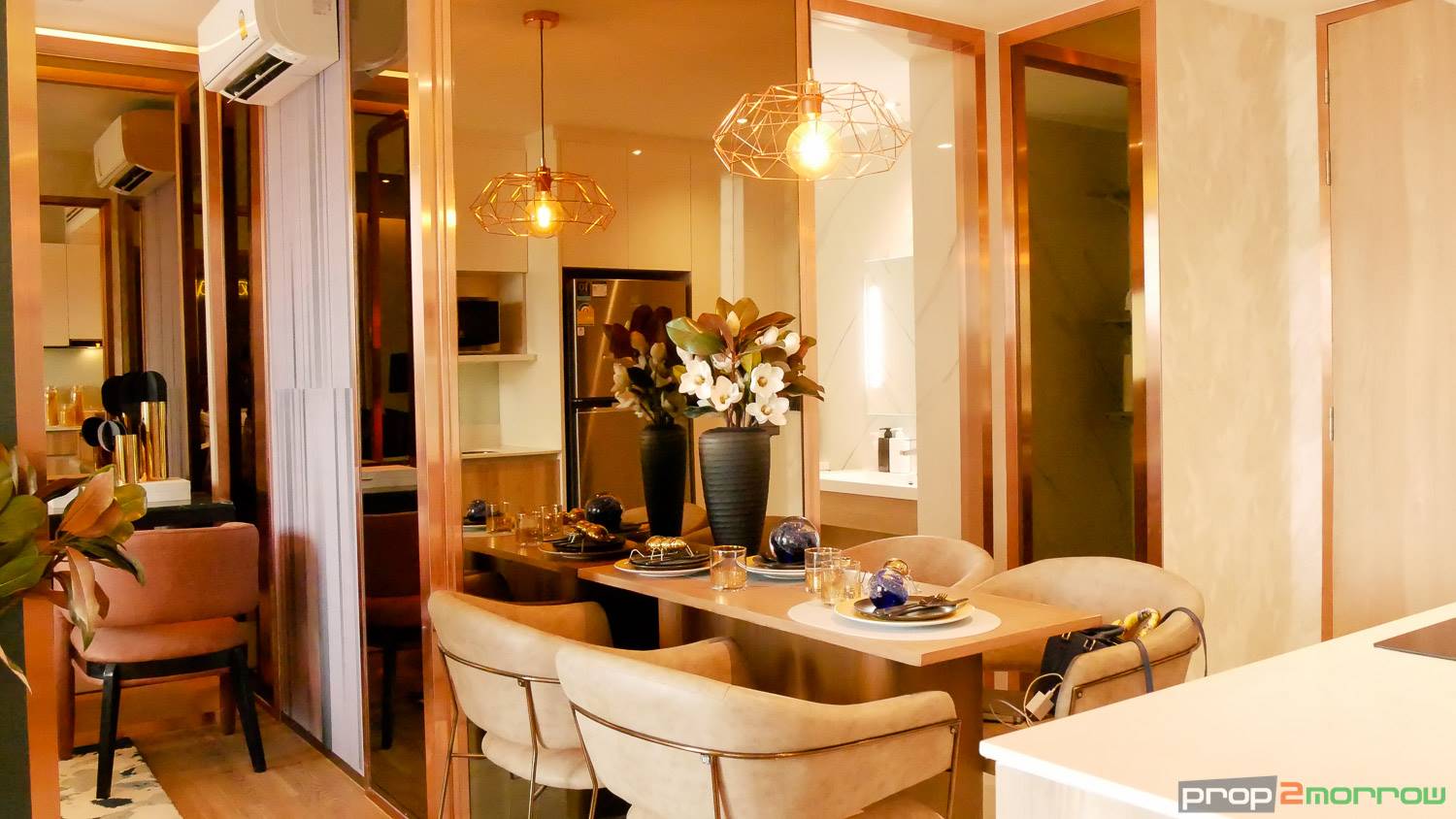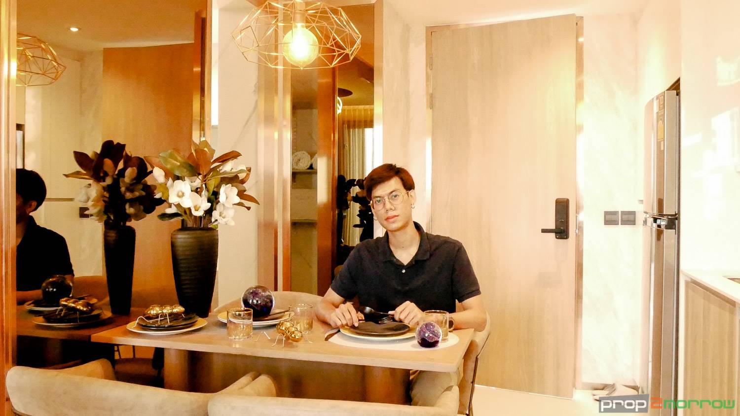 เปิดประตูเข้าไปจะเป็นส่วนของพื้นที่ห้องครัว และพื้นที่สำหรับรับประทานอาหาร ที่ทางโครงการได้จัดว่างไว้อย่างลงตัว ซึ่งส่วนนี้จะได้ต่างจากแบบ Studio คือได้พื้นที่รับประทานอาหารเพิ่มขึ้นมา ส่วนของครัวก็ได้เหมือนกับแบบ Studio ได้เตาไฟฟ้า เครื่องดูดควัน และบิ้วอินตู้ และชั้นวางไมโครเวฟไว้เรียบร้อย เพราะแบ่งพื้นที่วางตู้เย็น และจัดพื้นที่วางเครื่องซักผ้าพร้อมต่อท่อสายน้ำทิ้งเอาไว้ให้เรียบร้อย