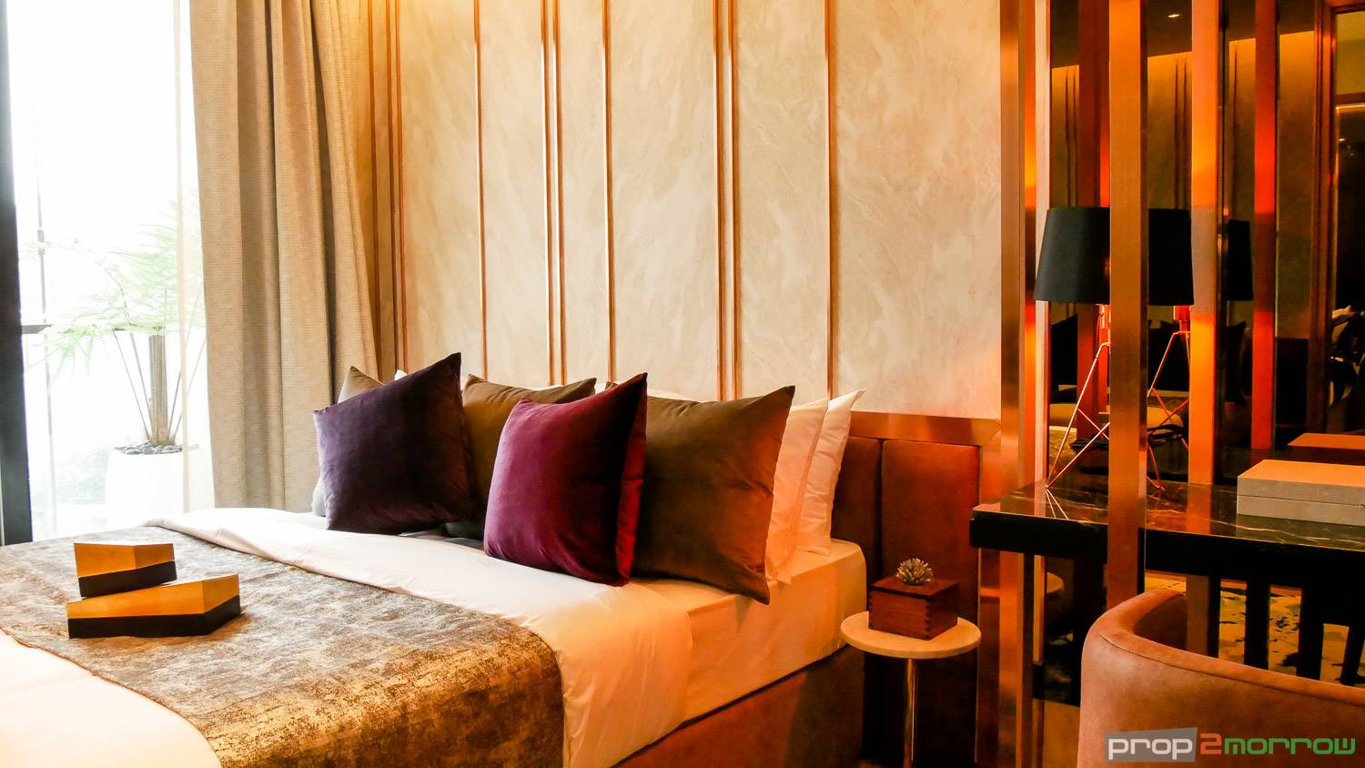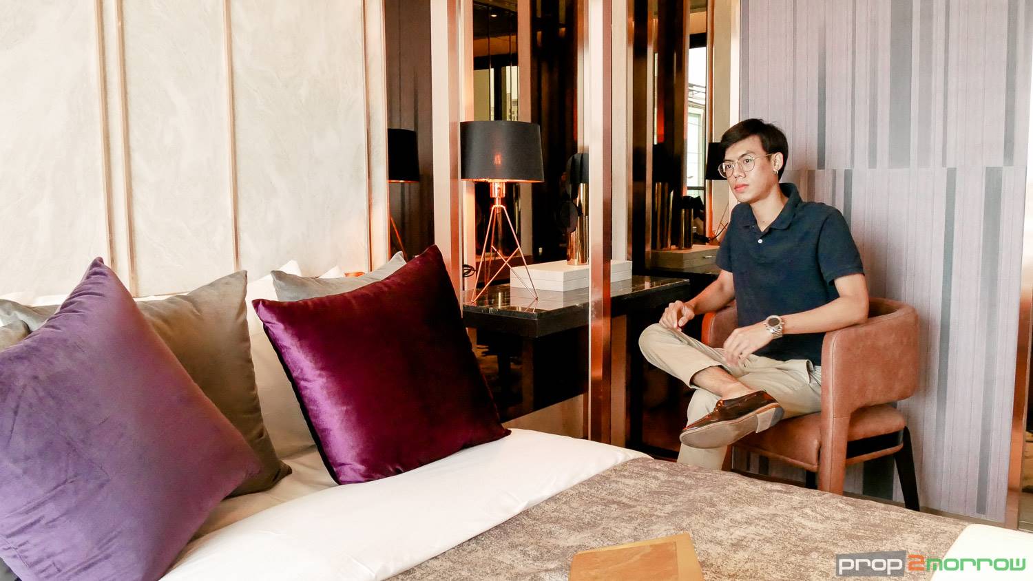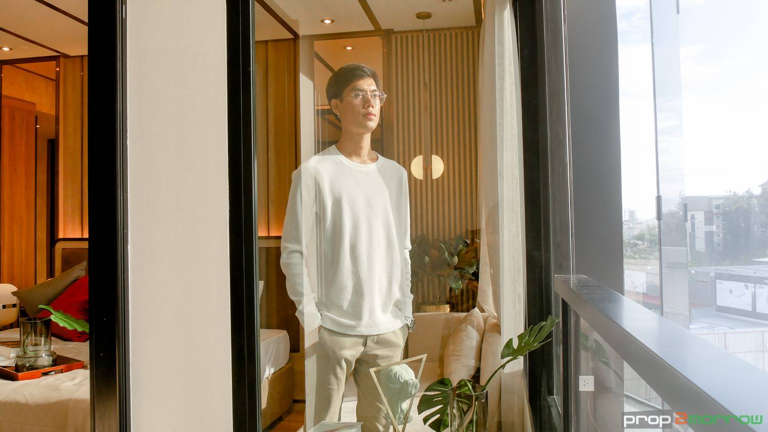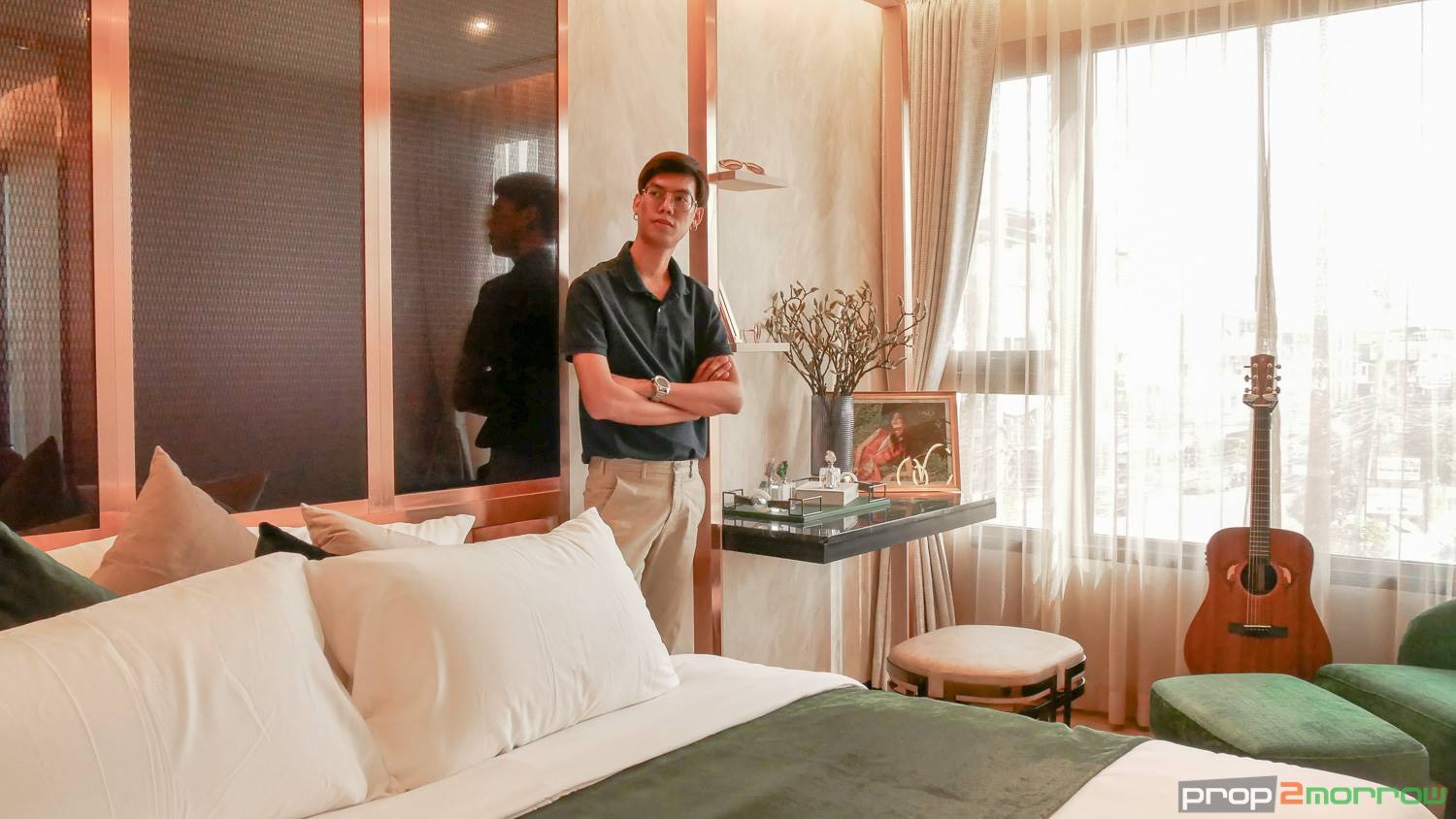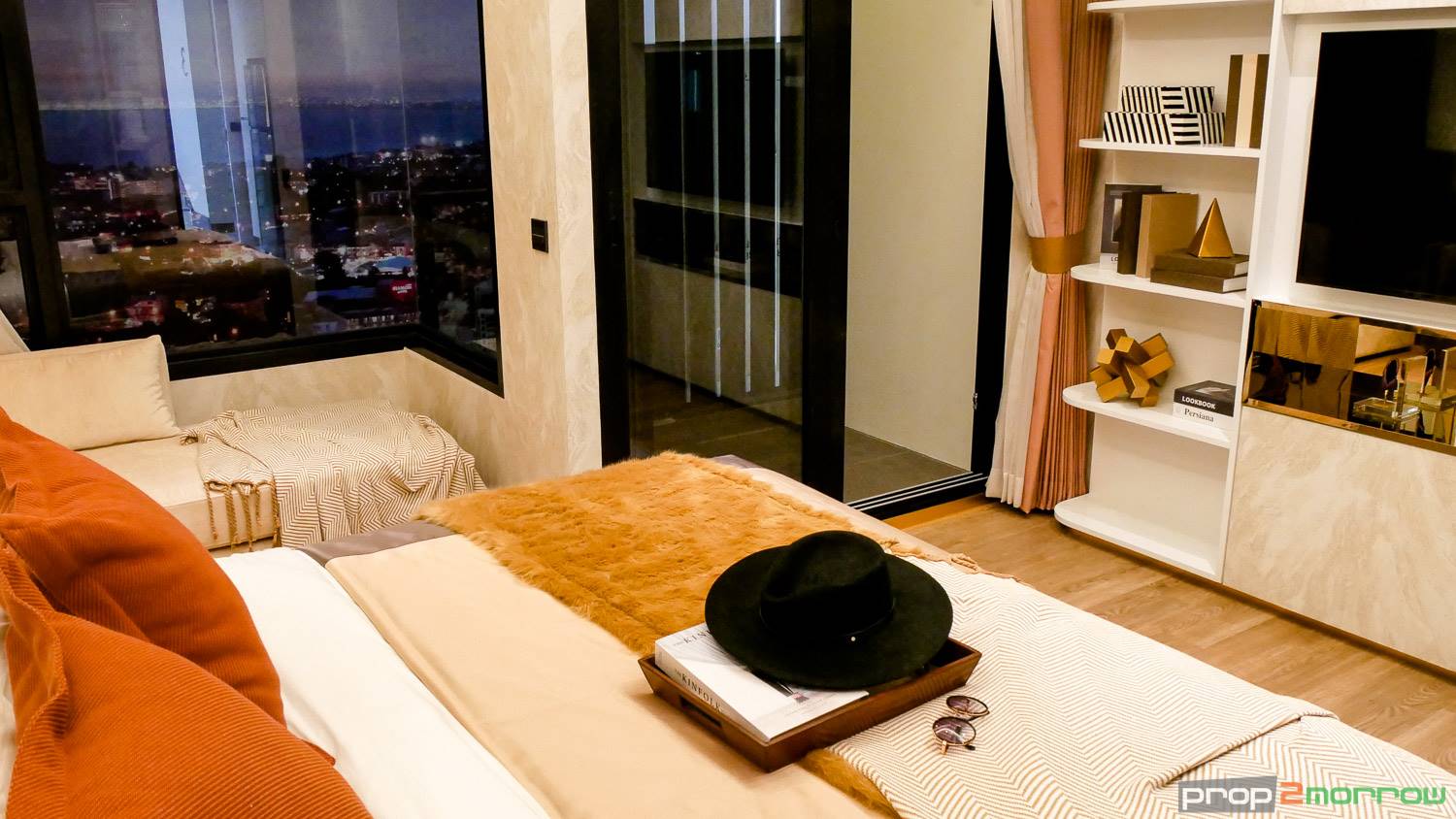 ห้อง Master Bedroom ผนังด้านที่ติดกับห้องนั่งเล่น ทางโครงการให้เป็นกระจกบานใหญ่ ทำให้ห้องดูโล่ง โปร่ง แต่หากพักอาศัยจริงอาจติดผ้าม่านเพิ่มเพื่อความเป็นส่วนตัว