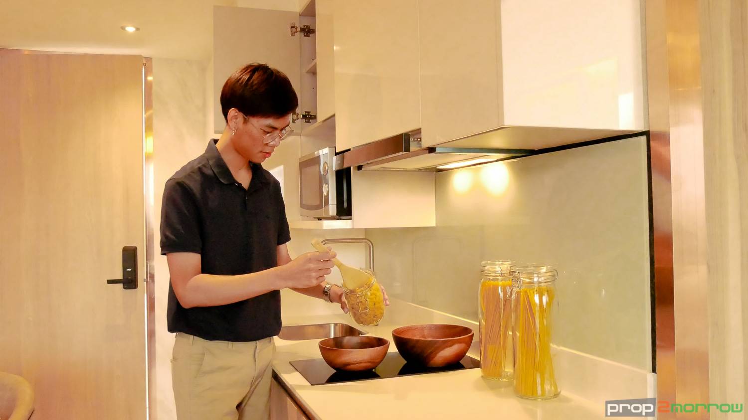 เปิดประตูเข้ามาเป็นส่วนของครัวที่ทางโครงการออกแบบให้ ขนาดกะทัดรัด มีเตาไฟฟ้า เครื่องดูดควัน และทางโครงการบิ้วอินตู้เก็บของ และช่องสำหรับว่างไม่โครงเวฟไว้ให้ และยังเว้นช่องเป็นพื้นที่สำหรับวางตู้เย็น และเครื่องซักผ้าแบบฝาหน้า (ทางโครงการไม่ได้ให้เครื่องซักผ้า ก่อนไปซื้ออย่าลืมวัดขนาดพื้นที่ได้ด้วยนะ กันพลาด) ไว้ให้ด้วย
