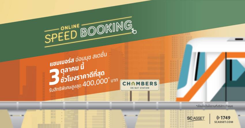 SC ASSET เตรียมพร้อมจัดรอบพิเศษ Online Speed Booking ในวันที่ 3 ต.ค. นี้ เปิดให้จับจองห้องสวยในราคาดีที่สุด เพียง 3 ชั่วโมงเท่านั้น โดยชั้นที่จะเปิดมีชั้น 2, 3 และ 4 CHAMBERS ON NUT STATION ราคาเริ่มต้นเพียง 2.89* ล้านบาท เตรียมตัวไว้ให้ดีเพราะ SC ASSET มอบสิทธิพิเศษส่วนลดสูงสุดถึง 400,000* บาท ลงทะเบียนได้ที่ http://bit.ly/2LhoWk4 หรือสอบถามเพิ่มเติมได้ที่ www.scasset.com รายละเอียดเพิ่มเติมโทร 1749