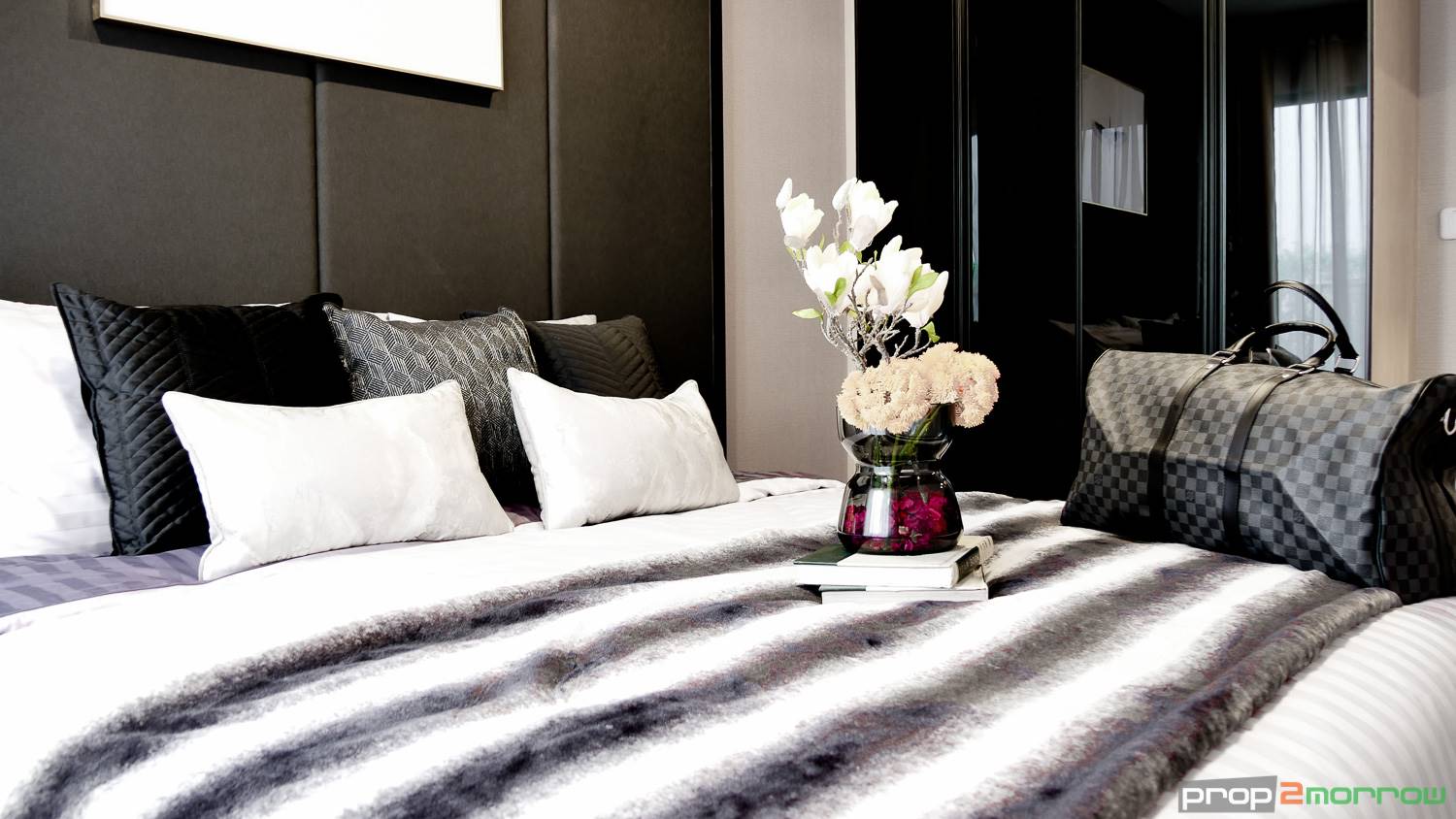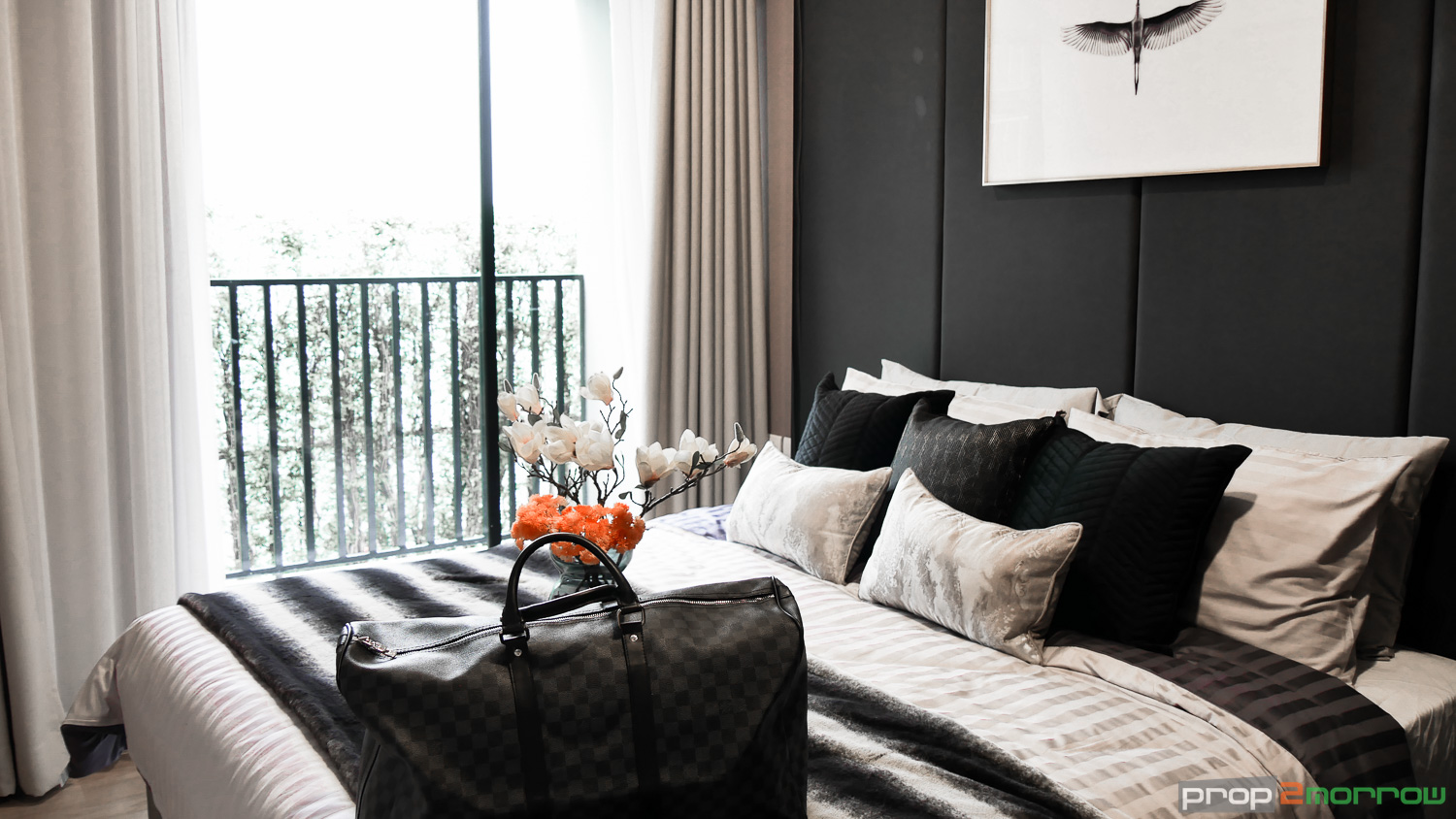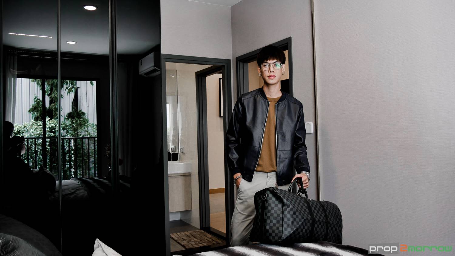 ห้องนอนอยู่ถัดจาก Living Area แบ่งพื้นที่ด้วยกระจกบานสไลด์กั้นเป็นสัดส่วน ห้องกว้างสามารถวางเตียงขนาด 6 ฟุต ยังเหลือพื้นที่ ทางโครงการบิ้วอินตู้เสื้อผ้าไว้ให้ด้วย ด้านในเป็นกระจกบานกว้างสามารถนอนชมวิวได้ และได้กระจกบานกระทุ้ง สามารถเปิดเพื่อระบายอากาศได้