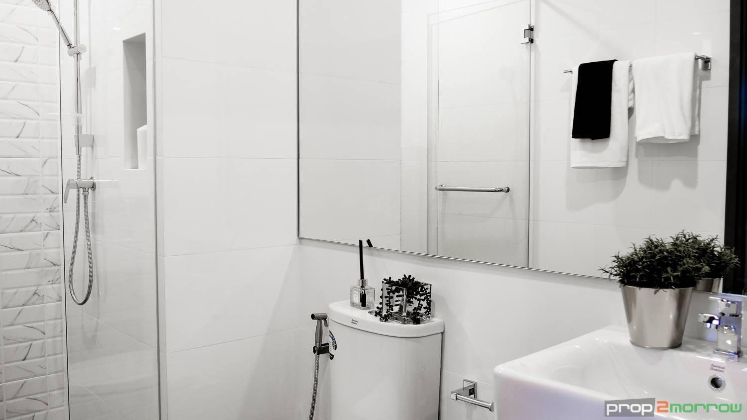 ส่วนของห้องน้ำอยู่ด้านใน ได้เป็นแบบ Shower Box ขนาดห้องน้ำค่อนข้างกว้าง แยกพื้นที่ส่วนแห้ง และส่วนเปียก