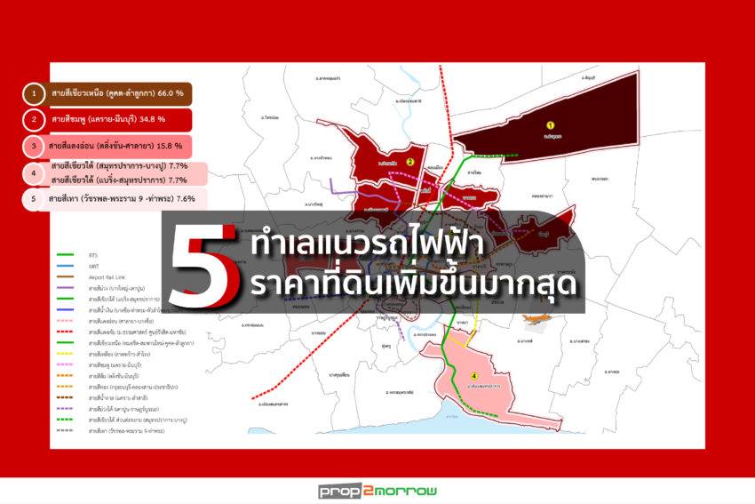 ทั้งนี้ เมื่อพิจารณาเฉพาะทำเลที่มีเส้นทางรถไฟฟ้าผ่าน 5 อันดับแรกที่มีอัตราการเปลี่ยนแปลงของราคาเพิ่มขึ้นสูงสุด เมื่อเทียบกับช่วงเวลาเดียวกันของปีก่อน (YoY) พบว่าส่วนใหญ่เป็นทำเลที่มีแนวเส้นทางรถไฟฟ้าที่อยู่ระหว่างก่อสร้าง และที่มีแผนจะก่อสร้างในอนาคต ได้แก่