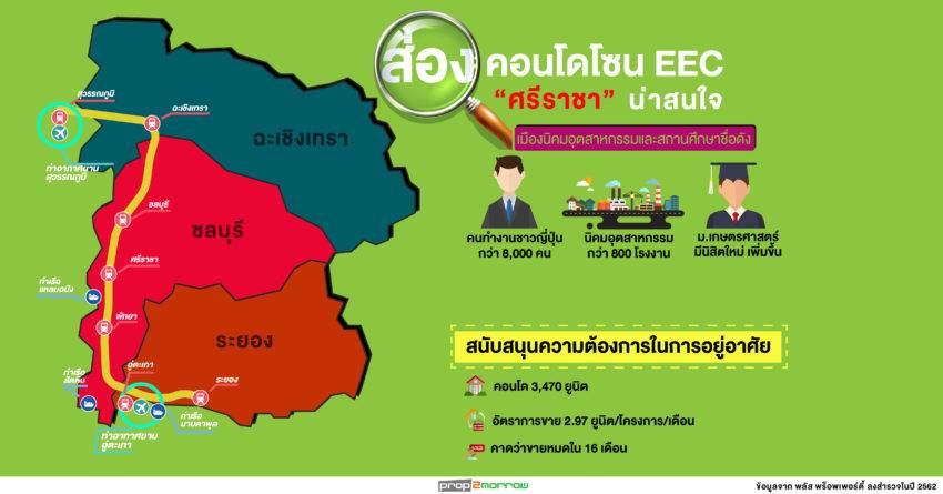 จากการสำรวจพบว่าที่อยู่อาศัยในโซนศรีราชา ณ ต้นปี 2562 มีทั้งสิ้น 7,072 ยูนิต หรือคิดเป็นมูลค่า 17,721 ล้านบาท คอนโดมิเนียมมีสัดส่วนมากเป็นอันดับหนึ่งหรือคิดเป็น 49% มียูนิตเสนอขายอยู่ 3,470 ยูนิต หรือคิดเป็นมูลค่า 10,059 ล้านบาท ซึ่งลดลงจากการปรับตัวของผู้ประกอบการที่ระบายโครงการเก่า ด้านระยะเวลาการขายได้ของโครงการคอนโดมิเนียมในโซนนี้อยู่ที่ 2.97 ยูนิตต่อโครงการต่อเดือน และคาดว่าจะขายหมดในราว 16 เดือน ระดับราคาที่เสนอขายอยู่ที่ 3.5 – 6 ล้านบาท และระดับราคา 6 – 15 ล้านบาท ซึ่งเป็นระดับราคาที่ตอบโจทย์นักธุรกิจชาวต่างชาติที่มาทำงานในโรงงานในพื้นที่ EEC รวมถึงกลุ่มพนักงานชาวไทย และกลุ่มผู้ปกครองที่ซื้อให้บุตรหลานที่มาศึกษาเล่าเรียน