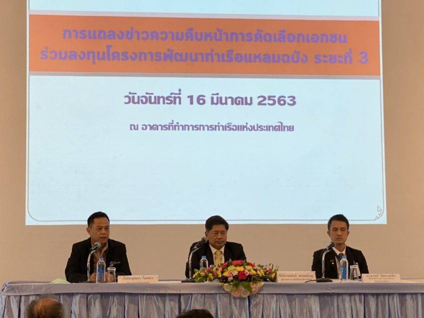 เรือโท กมลศักดิ์ พรหมประยูร ผู้อำนวยการการท่าเรือแห่งประเทศไทย (กทท.)ในฐานะประธานคณะกรรมการคัดเลือกเอกชนร่วมลงทุนโครงการพัฒนาท่าเรือแหลมฉบัง ระยะที่ 3 พร้อมด้วย เรือโท ยุทธนา โมกขาว ผู้อำนวยการท่าเรือแหลมฉบัง (ทลฉ.) และ ดร.ธาริศร์ อิสสระยั่งยืน ผู้ช่วยเลขาธิการคณะกรรมการนโยบายเขตพัฒนาพิเศษภาคตะวันออก ร่วมกันแถลงข่าวความคืบหน้าการดำเนินการคัดเลือกเอกชนร่วมลงทุนโครงการพัฒนาท่าเรือแหลมฉบัง ระยะที่ 3 ในส่วนของท่าเทียบเรือ F โดยมีรายละเอียด ดังนี้ มีกลุ่มบริษัทที่สนใจเข้ายื่นซองข้อเสนอรวม 2 ราย ได้แก่ กลุ่มกิจการร่วมค้า NCP และกลุ่มกิจการร่วมค้า GPC