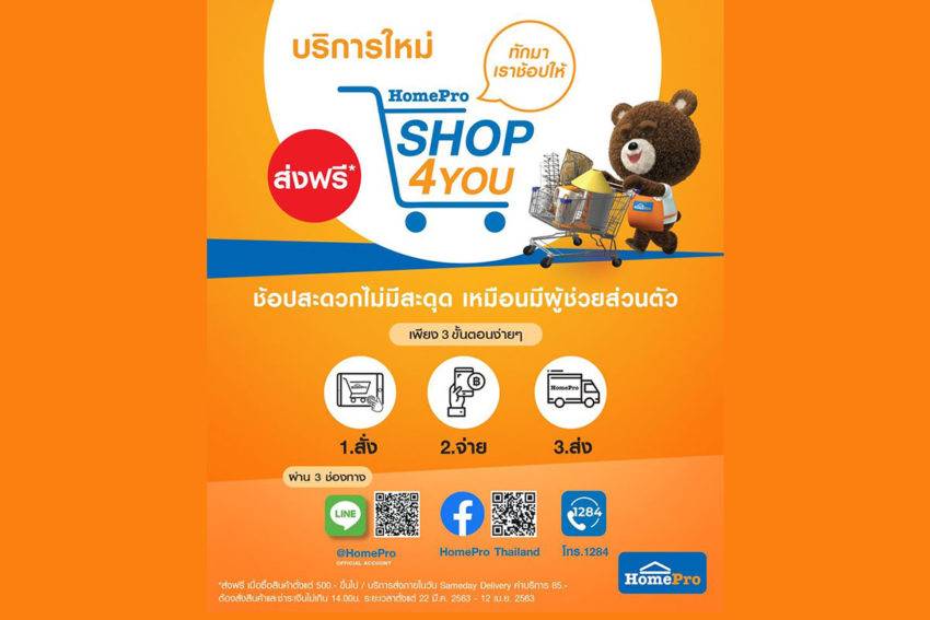 โฮมโปร เล็งเห็นความสำคัญในการป้องกันไวรัสโควิด-19 จึงได้เปิดบริการใหม่ SHOP4YOU เพียงเพิ่มเพื่อนใน Line @Homepro หรือ โทร 1284 “ทักมาเราช้อปให้” แค่นี้ง่ายๆ เหมือนมีผู้ช่วยส่วนตัว ในการช้อปสินค้าเรื่องบ้านผ่านช่องทางออนไลน์ของโฮมโปร ทั้งยังช่วยเอื้ออำนวยความสะดวกให้กับลูกค้าตลอด 24 ชั่วโมง เริ่ม ตั้งแต่วันที่ 23 มีนาคม 2563 เป็นต้นไป ด้วย 3 ขั้นตอนง่ายๆ
