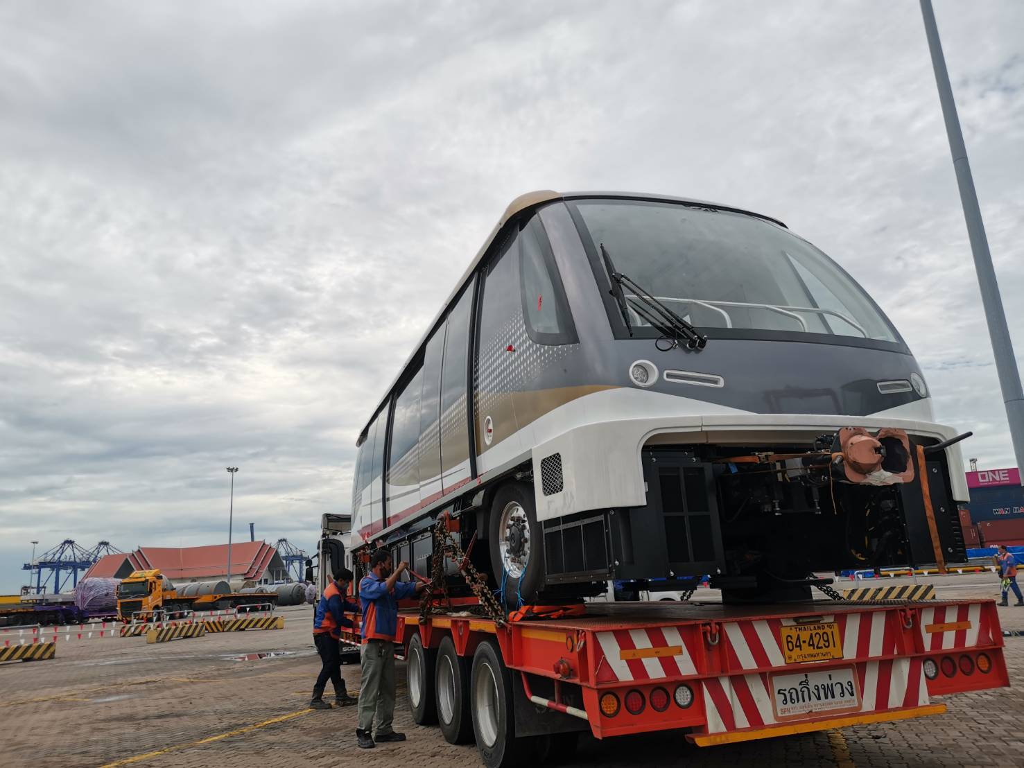 เมื่อวันที่ 18 มิถุนายน 2563 เวลา 10.30 น. รถไฟฟ้าสายสีทอง รุ่น Bombardier Innovia APM 300 ขบวนแรกของประเทศไทย ได้เดินทางมาถึง ท่าเรือแหลมฉบัง จ.ชลบุรี เป็นที่เรียบร้อยโดยมี นายมานิต เตชอภิโชค กรรมการผู้อำนวยการบริษัท กรุงเทพธนาคม จำกัด (เคที) และนายสุมิตร ศรีสันติธรรม ผู้อำนวยการใหญ่สายปฏิบัติการ บริษัท ระบบขนส่งมวลชนกรุงเทพ จำกัด (มหาชน) นำคณะผู้บริหารหน่วยงานที่เกี่ยวข้องรับขบวนรถไฟฟ้า ณ ท่าเรือ เอ 2 ท่าเทียบเรือแหลมฉบัง จ.ชลบุรี