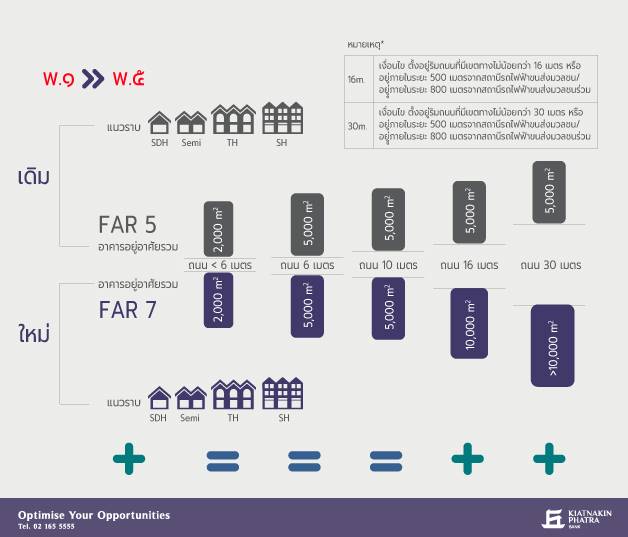 ที่ดินบริเวณที่อยู่ในรัศมี 500 ม. จากสถานีรถไฟฟ้าสายสีเหลือง, สีชมพูที่กำลังก่อสร้างแล้วเสร็จ และติดริมถนนใหญ่ตั้งแต่ 10 ม. ขึ้นไป เช่น ถนนลาดพร้าว, มัยลาภ หรือที่ดินที่ติดถนนใหญ่ที่กว้าง 30 ม. ขึ้นไป เช่น ถนนรามอินทรา, ประเสริฐมนูกิจ, ประดิษฐ์มนูธรรม สามารถสร้างอาคารขนาดใหญ่พิเศษเกิน 10,000 ตร.ม./อาคารได้ แต่ก็มี FAR ไม่มากนัก ทำให้การพัฒนาเป็น High Rise ให้มีขนาดเกิน 10,000 ตร.ม. ควรมีที่ดินตั้งแต่ 2 ไร่ขึ้นไป