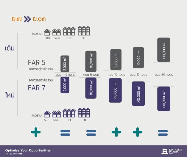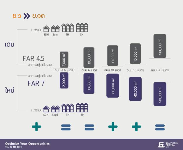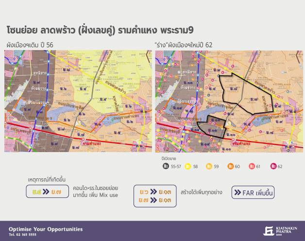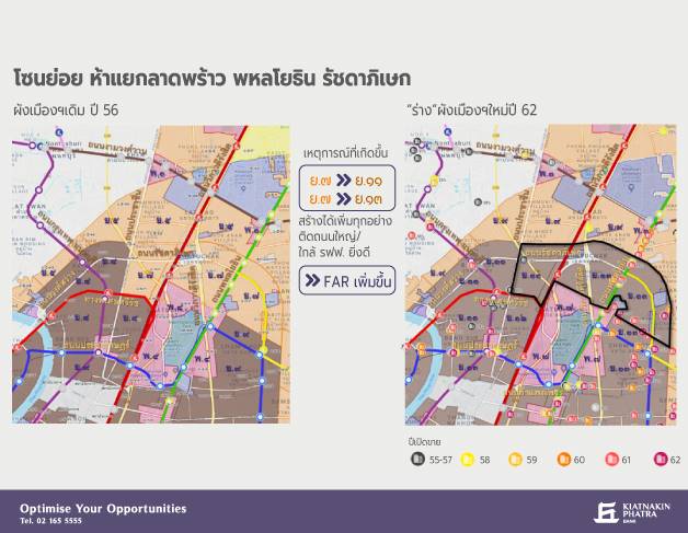 การเปลี่ยนจากพื้นที่สีส้ม ย.๗ เป็นพื้นที่สีน้ำตาล ย.๑๓ นั้น จะทำให้ศักยภาพที่ดินในบริเวณนี้ดีขึ้นเพราะมีการเพิ่ม FAR ให้มากถึง 7:1 สอดคล้องไปกับการเพิ่มศักยภาพในการพัฒนาที่ไม่จำกัดขนาดอาคาร เพียงแค่ตามกฎหมายควบคุมการก่อสร้างนั้นมีข้อกำหนดว่าถ้าจะพัฒนาอาคารขนาดใหญ่พิเศษที่ขนาดไม่เกิน 30,000 ตร.ม./อาคารนั้น ต้องอยู่ติดถนนกว้าง 10 ม. ขึ้นไป หรือขนาดเกิน 30,000 ตร.ม./อาคาร ต้องอยู่ติดถนนกว้าง 18 ม. ขึ้นไป และที่ดินต้องมีหน้ากว้างไม่น้อยกว่า 12 ม. จึงทำให้ที่ดินที่อยู่ในซอยหลักของถนนพหลโยธิน ถนนรัชดาภิเษก และถนนประชาชื่นในบริเวณดังกล่าวนี้ที่มีความกว้างถนนตั้งแต่ 10 ม. ขึ้นไปมีศักยภาพดีขึ้นมาก จากเดิมสร้างได้แค่ไม่เกิน 10,000 ตร.ม./อาคารเท่านั้น ถ้าที่ดินดังกล่าวสามารถเดินทางออกสู่รถไฟฟ้าสายสีเขียวบริเวณสถานีห้าแยกลาดพร้าว พหลโยธิน 24 และรัชโยธินที่เปิดให้บริการแล้วในช่วงนี้ได้ ก็จะทำให้มีความน่าสนใจในการพัฒนาเป็นคอนโดมิเนียมแบบ High Rise มากขึ้น