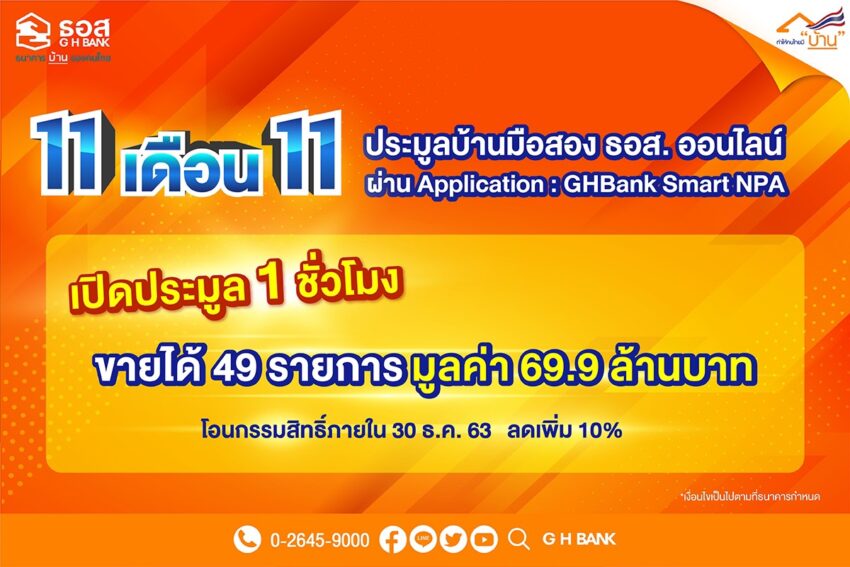 ธนาคารอาคารสงเคราะห์ เผยผลการจัดมหกรรม 11.11 ประมูลบ้านออนไลน์กับ ธอส. ผ่าน Application GH Bank Smart NPA ประจำเดือนพฤศจิกายน จำหน่ายทรัพย์ได้ทั้งสิ้น 49 รายการ มากที่สุดในรอบ 5 เดือน มูลค่ารวม 69.9 ล้านบาท แบ่งเป็นทรัพย์ในพื้นที่กรุงเทพฯ และปริมณฑล 12 รายการ และทรัพย์ในส่วนภูมิภาค 37 รายการ พิเศษ!! ผู้ชนะการประมูล รับส่วนลดราคาพิเศษเพิ่มให้อีก 10% จากราคาที่ปิดประมูล เพียงทำสัญญาและทำนิติกรรมให้แล้วเสร็จภายในวันที่ 30 ธันวาคม 2563