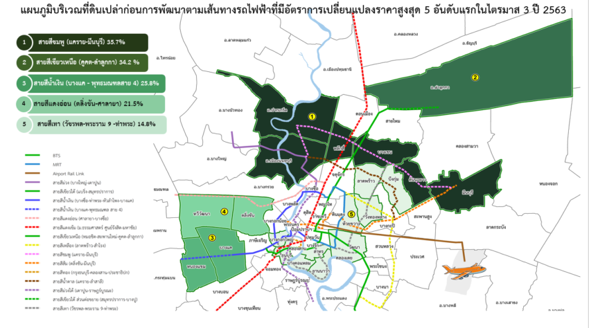 4) สายสีแดงอ่อน (ตลิ่งชัน – ศาลายา) ซึ่งเป็นโครงการที่มีแผนจะก่อสร้างในอนาคต มีอัตราการขยายตัวของราคาที่ดินเพิ่มขึ้นร้อยละ 21.5